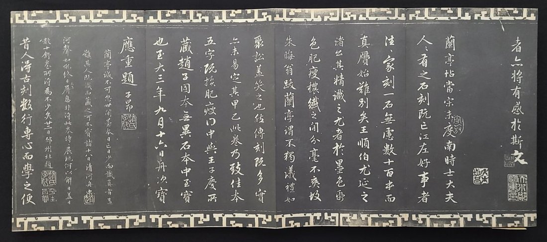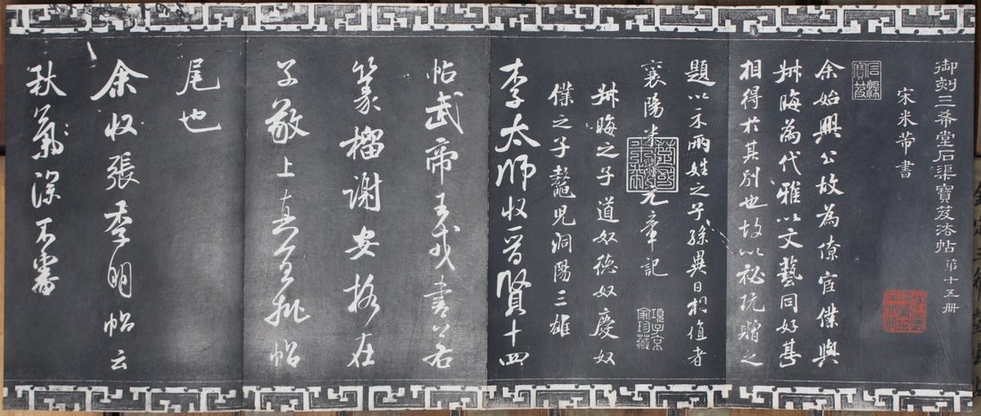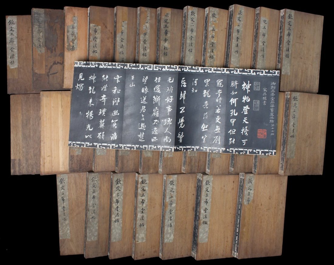 1910-1930 民國拓本 "御刻三希堂石渠寶笈法帖", 全套32 册, 此拍品上下皆有卍字紋邊框, 拓工精巧, 木夹板經折裝, 裝幀上承. 每册均帶鈐印 "趣園珍藏金石文字" 每册尺寸: 17.5x29.5cm