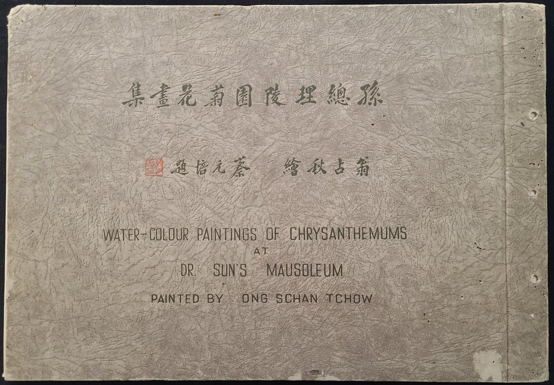 1939 First edition with author signed "Water-Colour Painting of Chrysanthemums at Dr. Sun's Mausoleum". painted by Ong Schan Tchow. Published by Tik Mui Art Association. Printed by The Asiatic Litho. Printing Press, Hong Kong. There are four missing pages and a small break in the inner page. 26.5x38.5cm