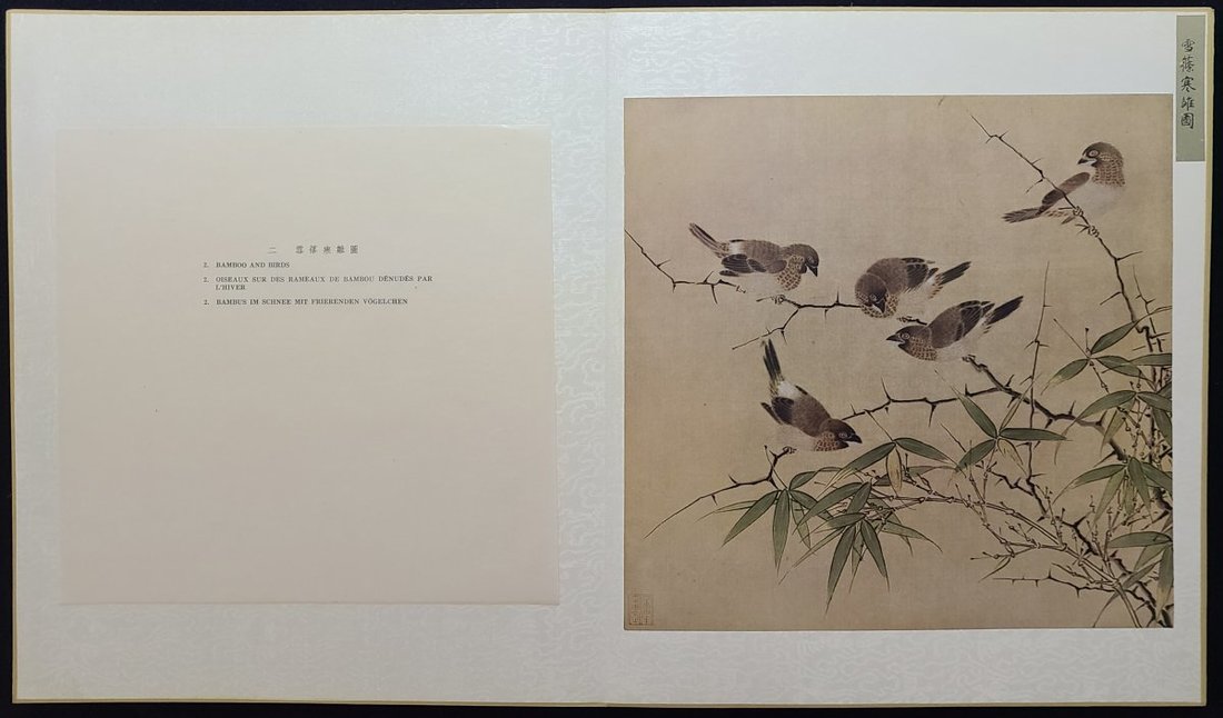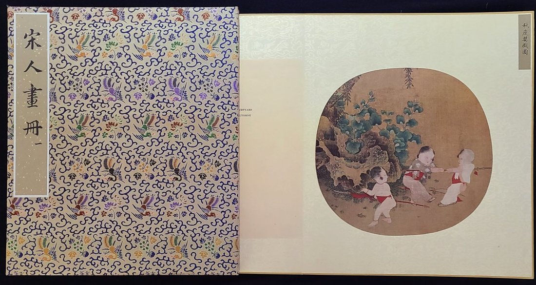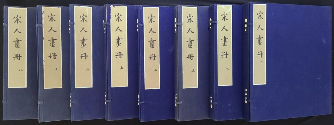 1950年代珂羅版彩色精印 "宋人畫册", 全套八册 (輯), 每册十圖, 原裝原函, 各册皆為經折裝, 綺麗宋錦書衣, 故宫博物院編印, 每册鈐印“故宫博物院出版品”之章, 全套八册齊全及保存漂亮 (只函套上白紙部份老化變黃), 極之少見. 每函尺寸: 33.5x38x3.8cm