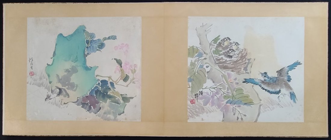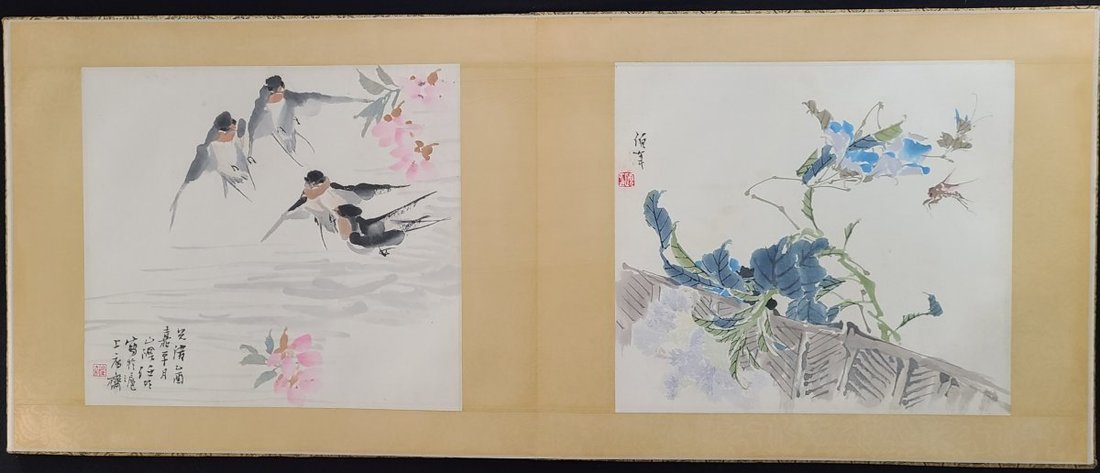 1950年代上海朵雲軒 "任伯年花鳥草蟲册" , 錦面經折裝, 內裱木版水印任伯年作品八幅. 畫面有小許老化黃斑. 畫面尺寸: 30.5x34.5cm