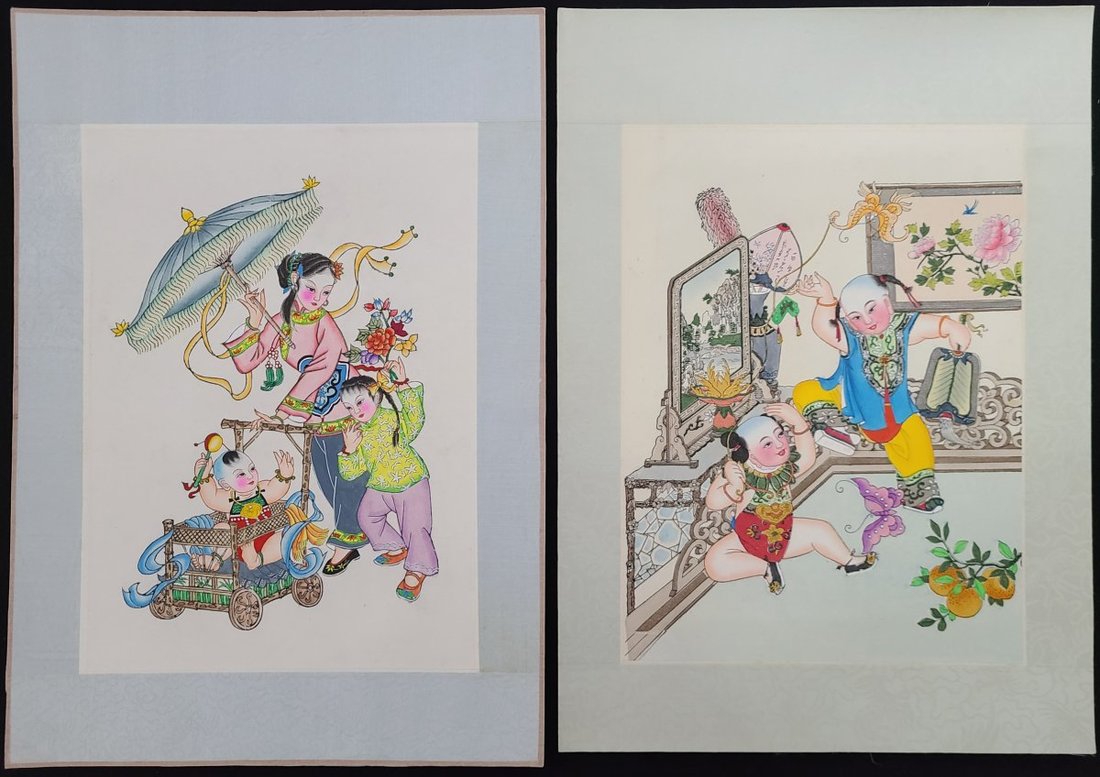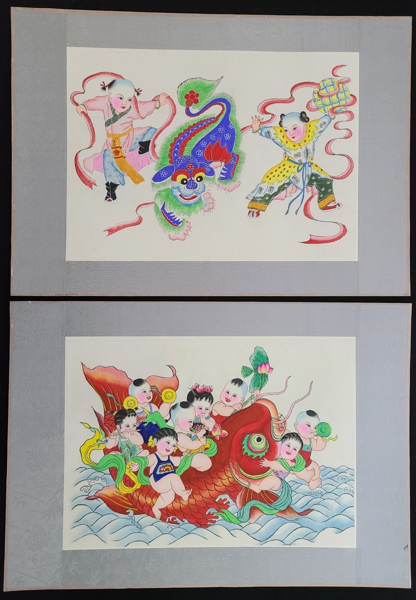 1960-70s A group of 24 Chinese woodcut color printing New Year pictures. All are Mounted. 31x43.5cm (included Mount paper)