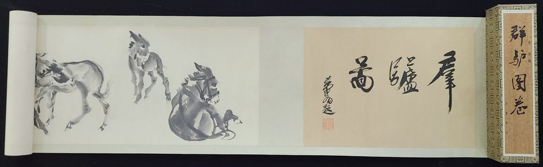 1980 Huang Zhou's "Paintings of Donkey Group" reprinted in original colors (with box) by Qilu Publishing House. Scroll size: 277x24.5cm