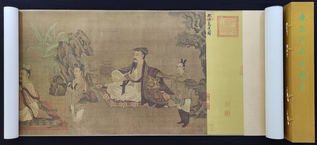 1980年代上海博物館原色重印 "唐孫位高逸圖卷", 連原裝盒. 圖卷尺寸: 568x46cm