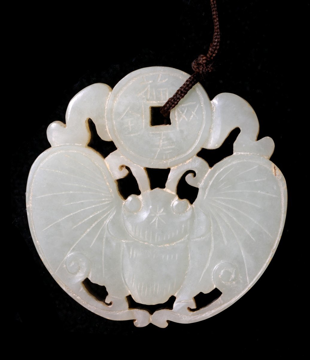 Fortune Money (ancient money and bat) white Jade 5.5x5.6cm
