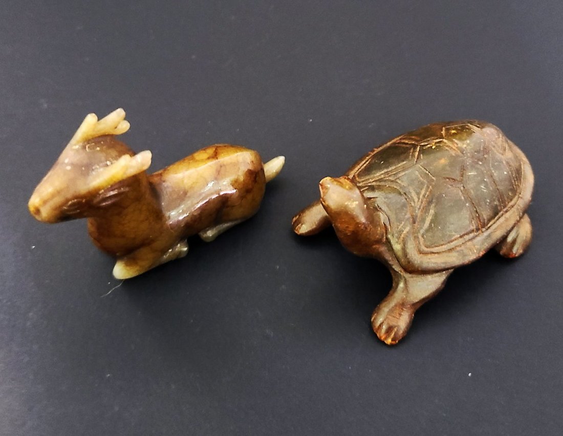 松花玉鹿及咖啡凍石龜各一件 3.4x5.4cm, 1.6x5cm