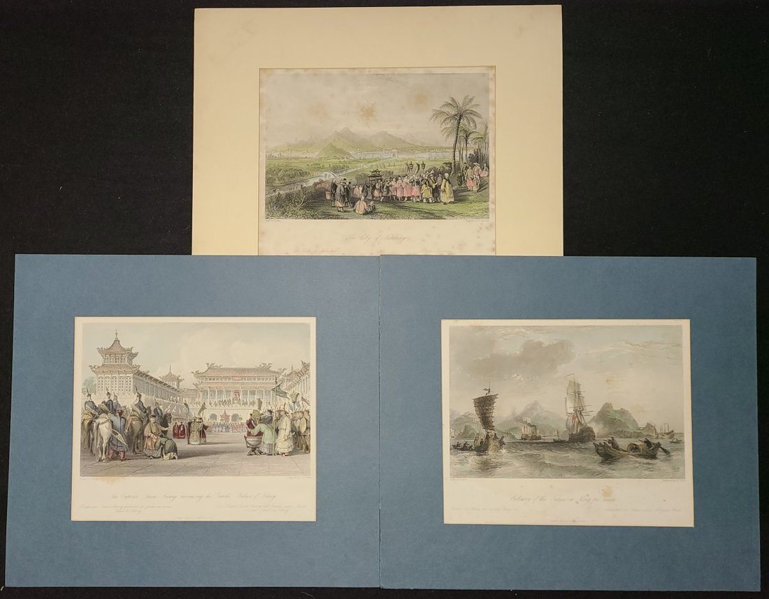 1840年代英國手上彩雕版畫三幅"The Emperor ' Teaou-Kwang' reviewing his Guards, Palace of Peking" (北京道光皇帝檢閱軍隊), "The City of Nanking" (南京城) 及"Estuary of the Tahea, or Ning -po river" (寧波海上). 有斑迹, 畫面尺寸: 每幅約16.5x20cm