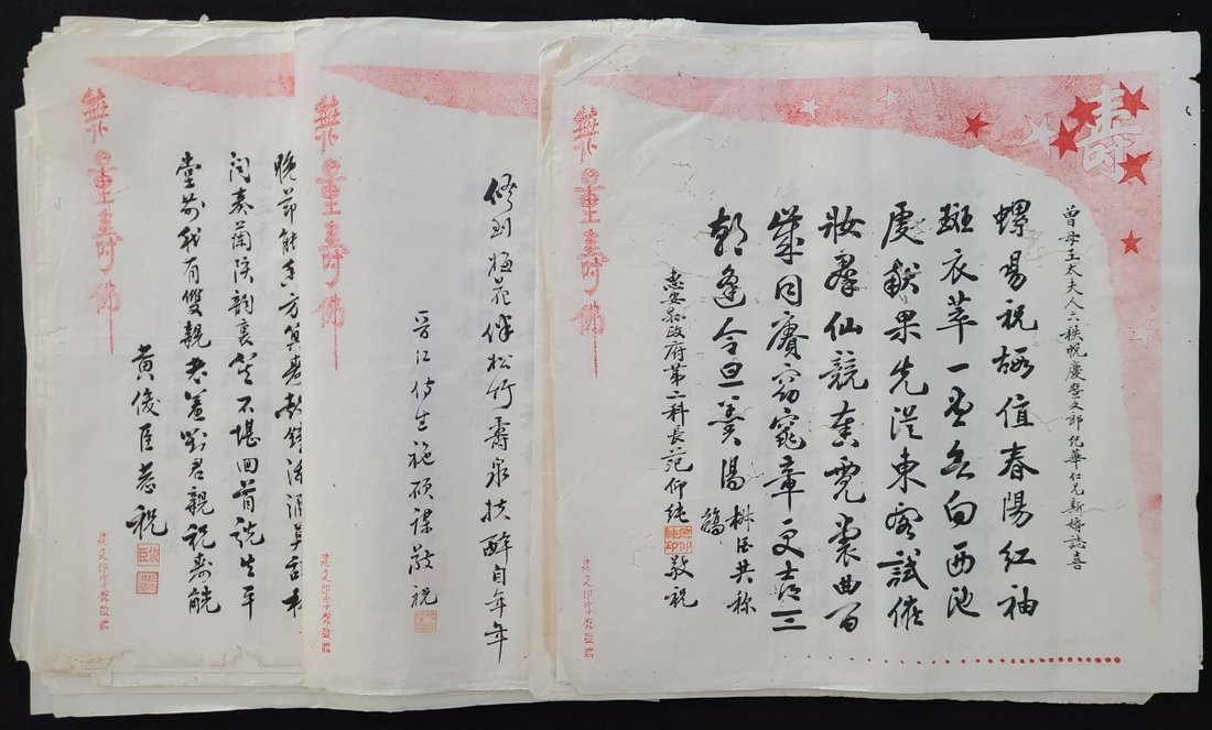 1935年福建曾紀堂母六秩之喜祝壽文箋一批共七十餘枚, 由當時福建晋江名流書寫. 每枚約34.5x34.5cm