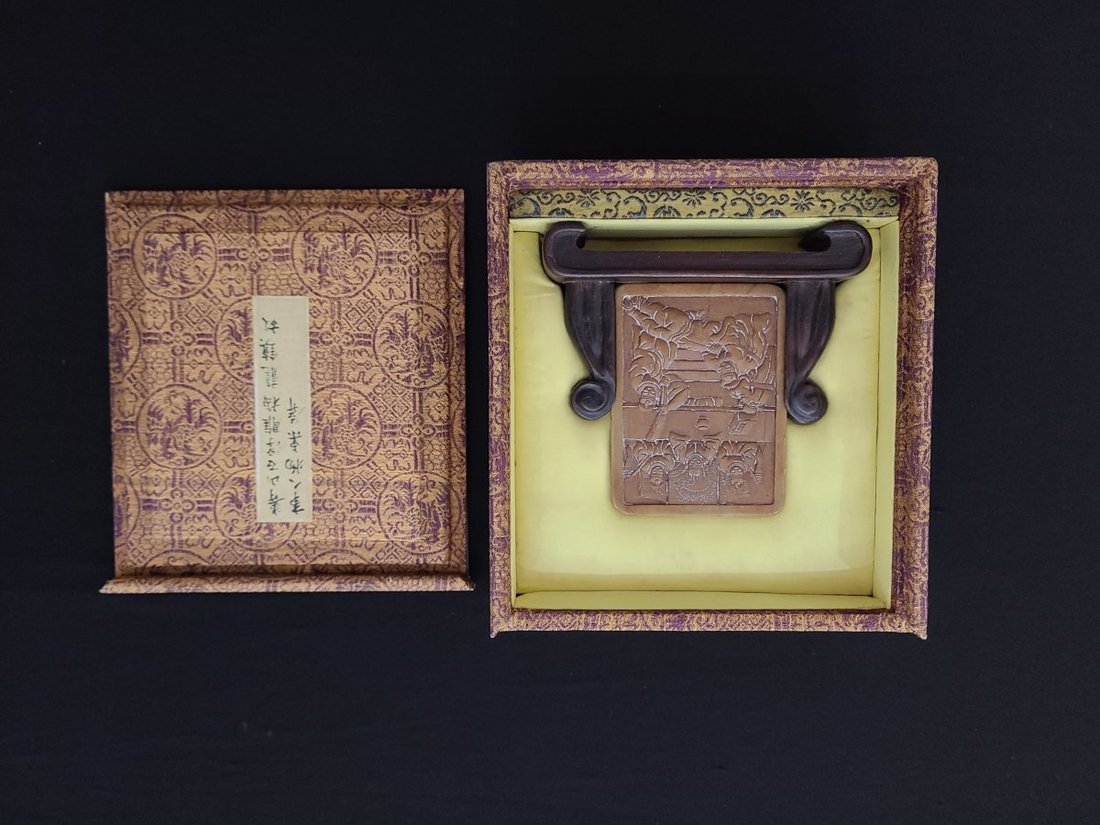 1970年代夀山石浮雕梅龍鎮故事人物桌屏; 正面人物浮雕, 背面是微雕李鳳姐故事. 連原盒, 連坐高11.5cm横12.5cm