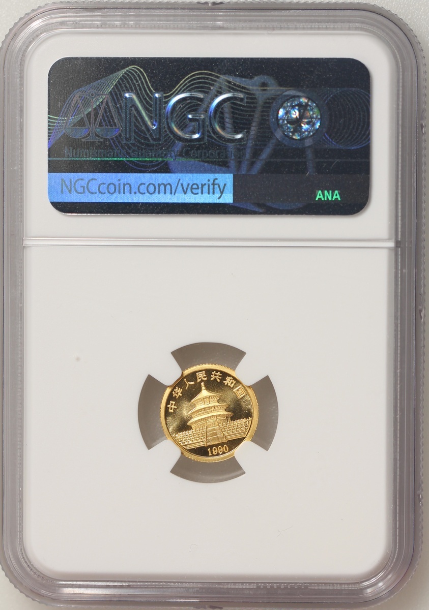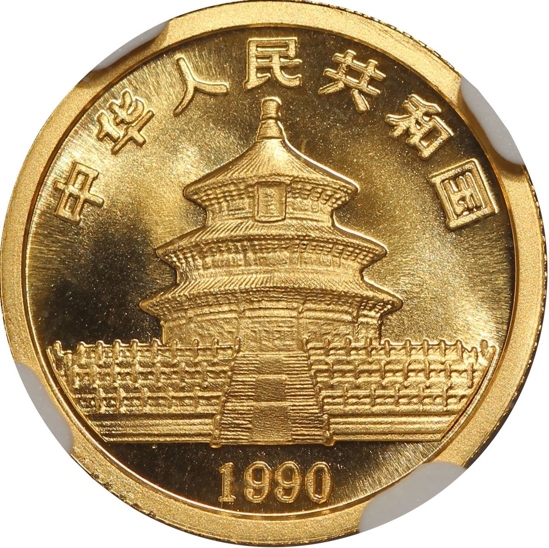 1990年中國小型熊貓5元金幣一對,日期大字版,每枚重1.56克,含.999金,總含金量3.12克(0.1盎士),均評NGC MS69,#6137205-006 及 #6137205-007