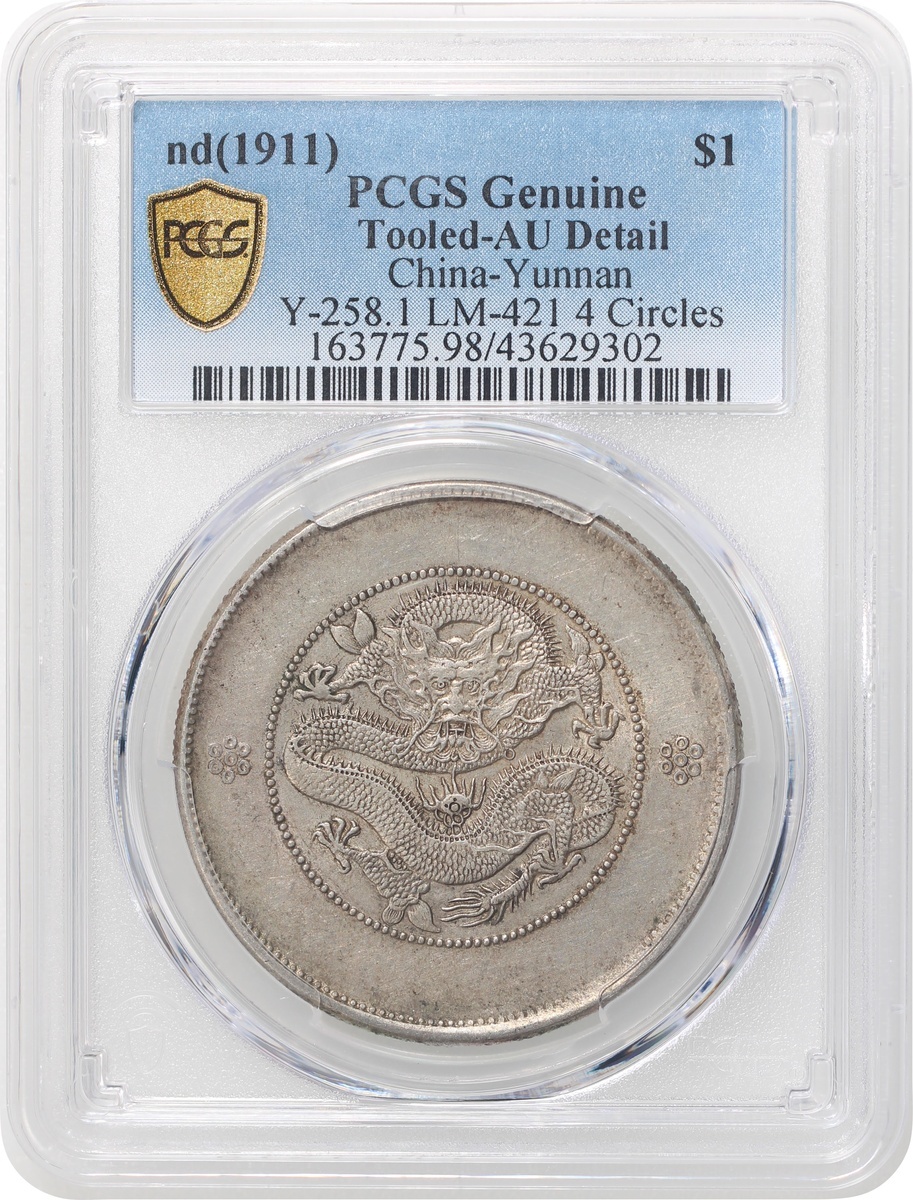 Yunnan Province, silver $1, Guangxu Yuan Bao(1911), new dragon, 4 circles, (LM-421), PCGS AU Detail, tooled. #43629302