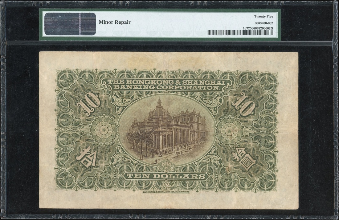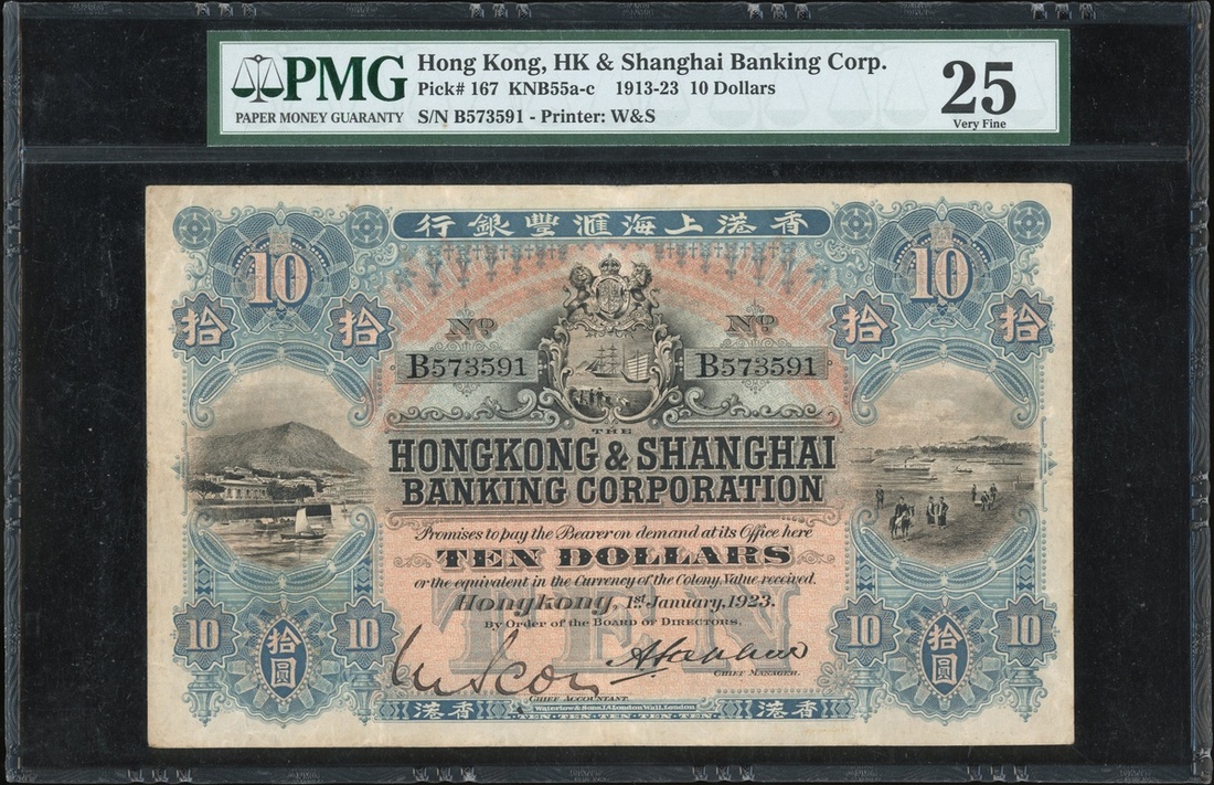 1923年香港上海匯豐銀行$10,編號B573591,左下有手簽,PMG 25,原色明亮,輕微修補,十分少見