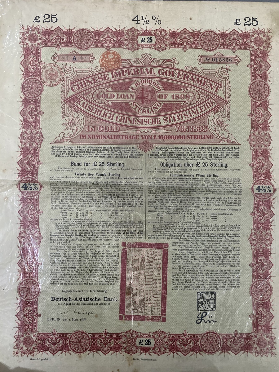 Chinese Imperial Government 4.5% Gold Loan, bond for 25 pound sterling, 1898, serial number 15856, very fine, with coupon.
