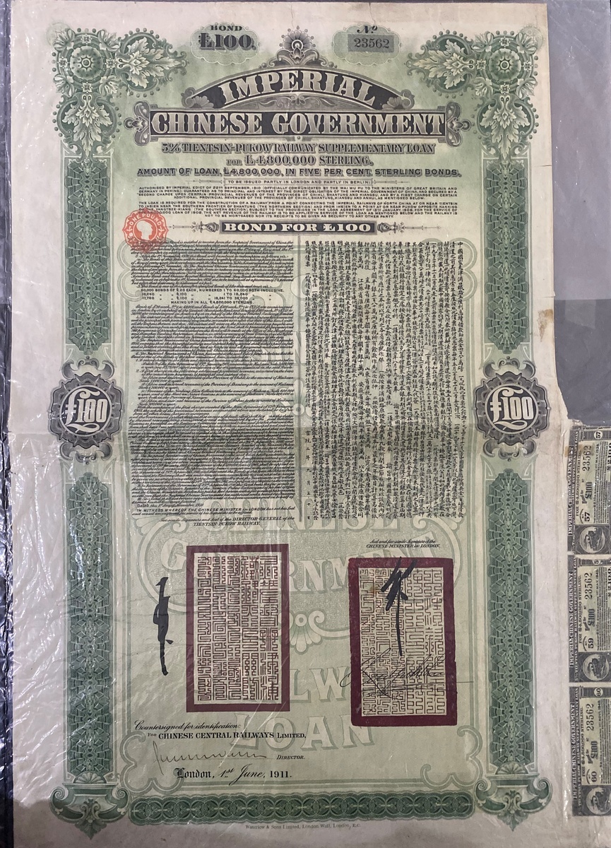 Chinese Imperial Government 5% Tientsin-Pukow Railway Supplementary Loan, bond for 100 pounds, 1911, serial number 23562, very fine.