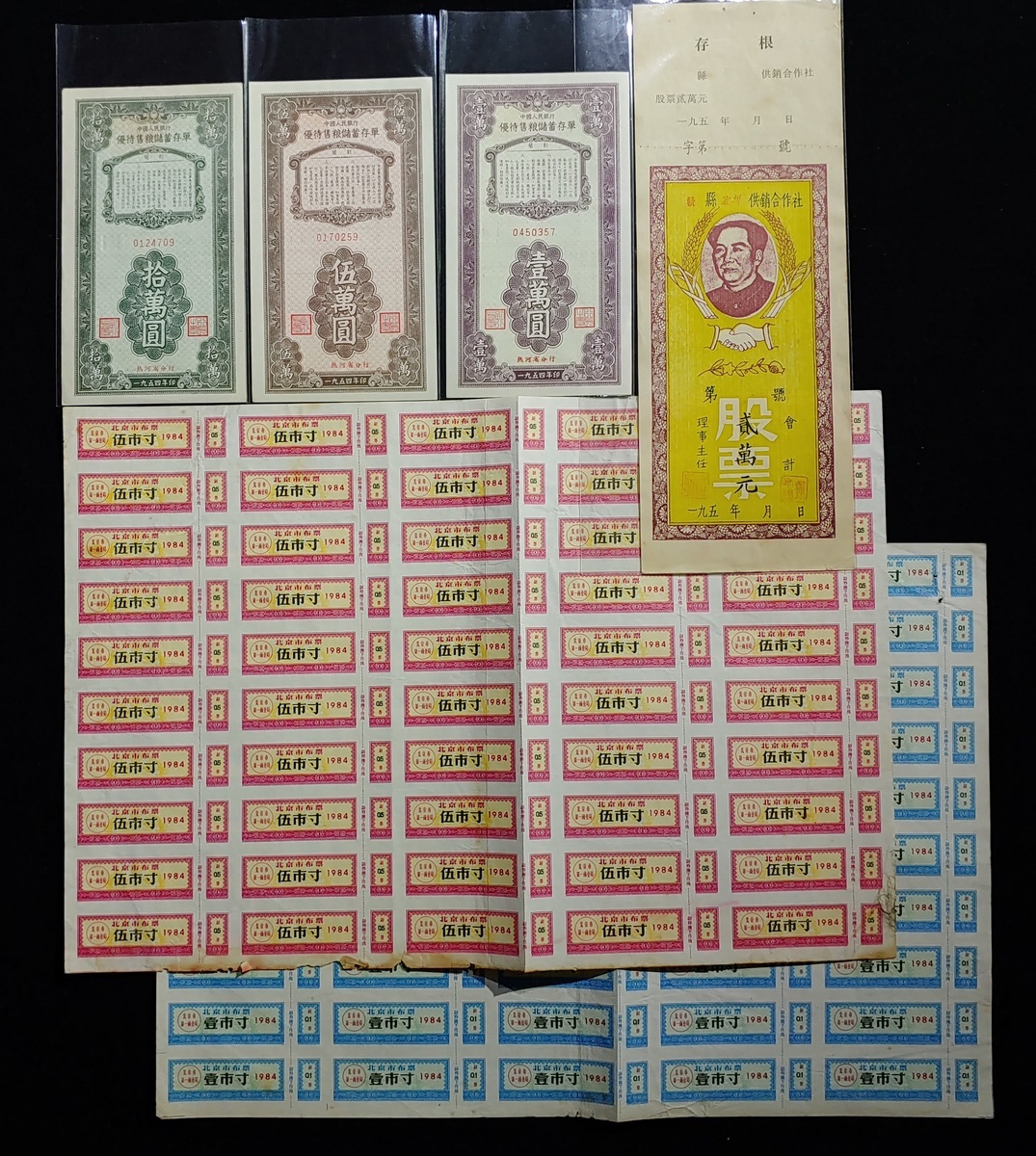 民國紙雜一組6枚,包括北京市布票2枚,壹市寸及五市寸,贛縣宜州供銷合作社2萬元股票,及中國人民銀行優待售糧儲蓄存單3枚,分別一萬、五萬及十萬元,均EF至AU品相,建議預覽