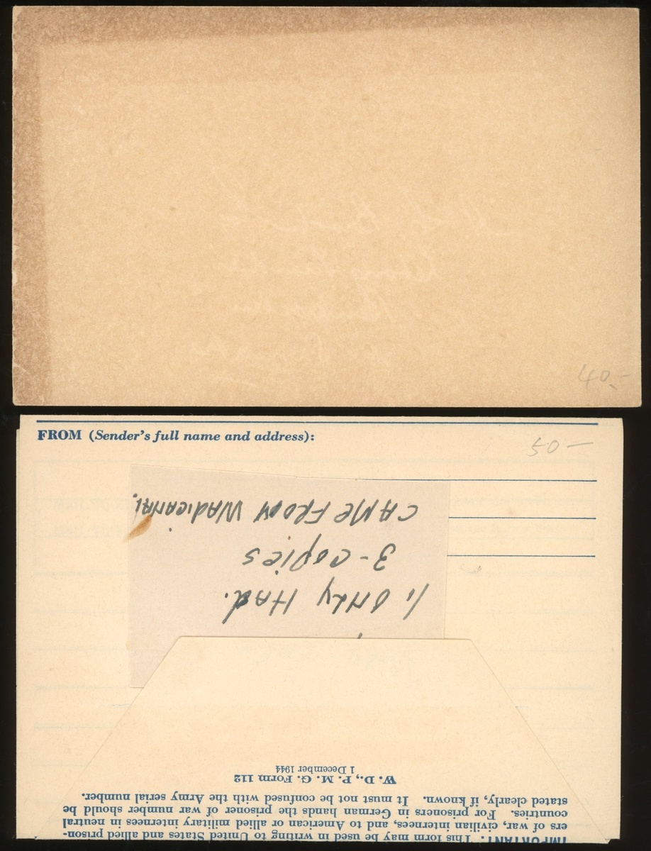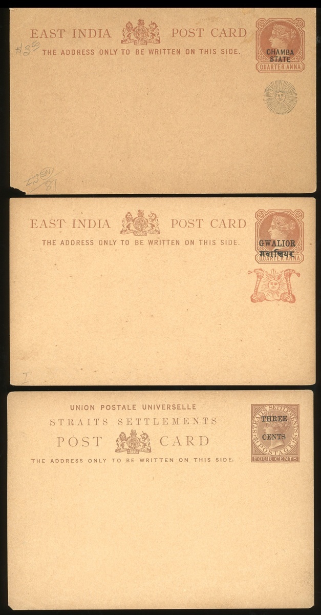 郵品一組4枚,三枚為19至20世紀未使用的古董郵票明信片,來自東印度、海峽殖民地及香港,另有一枚1944年未經使用之戰俘郵票信封,UNC,帶黃