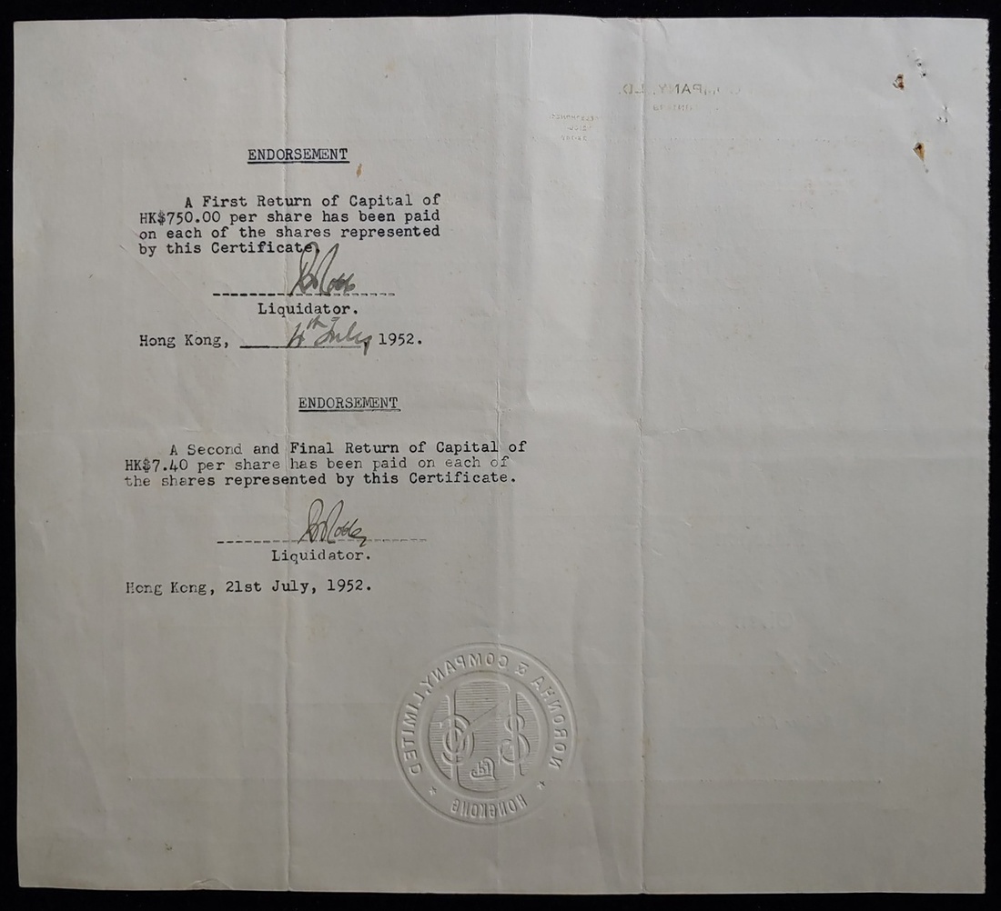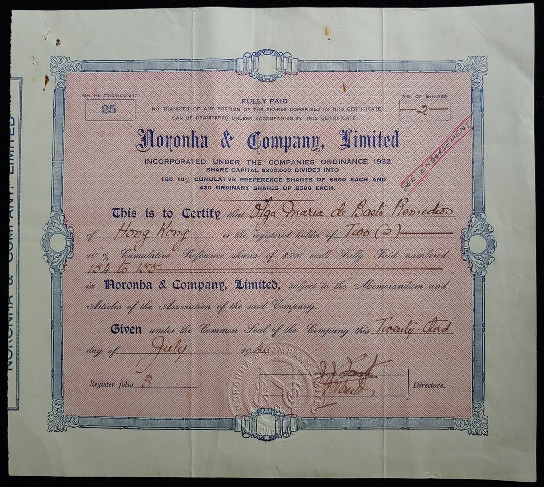 Noronha & Company Limited, Hong Kong, certificate for 2 shares each worth $500, 1940, number 25, about extremely fine.