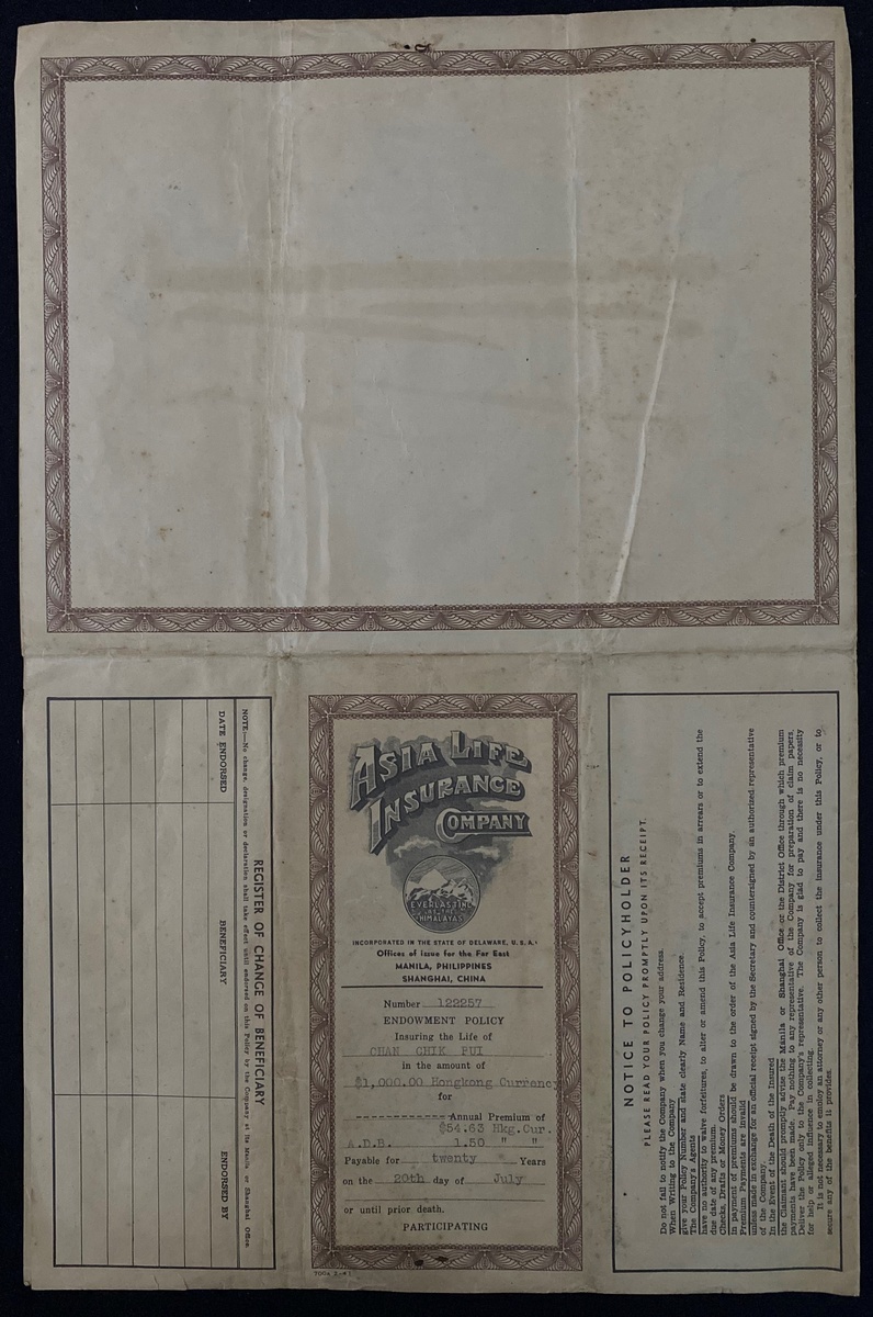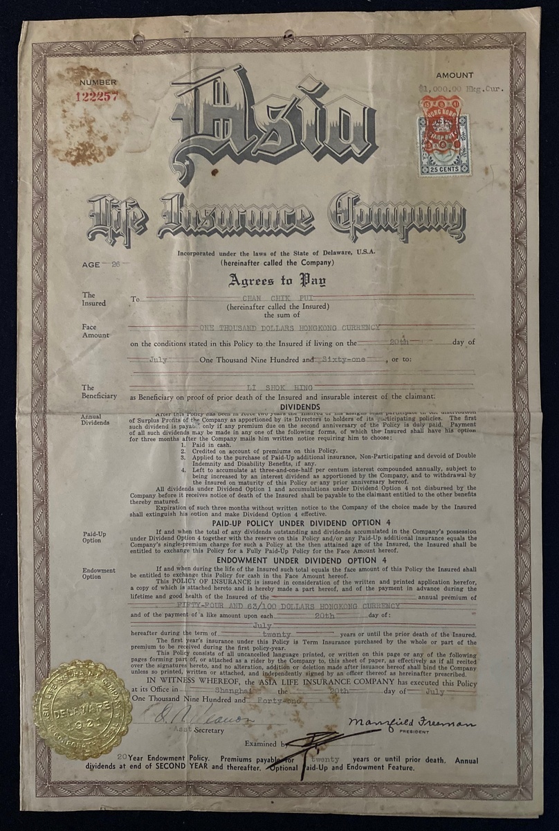 Asia Life Insurance Co. (HK), Insurance policy, 1961, number 122257, extremely fine.