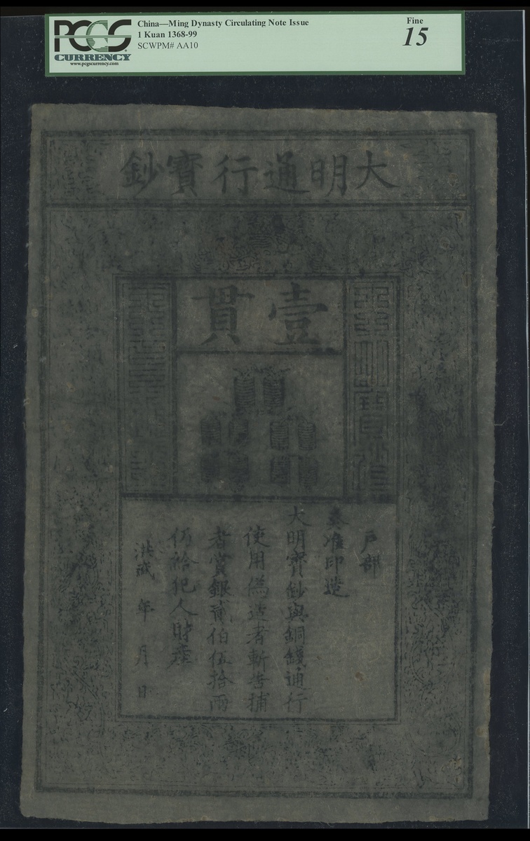 Ming Dynasty, Da Ming Bao Chao, 1 kuan, 1368-1399, (Pick AA10), PCGS Currency 15 Fine( Stains and Foreign Substance; Seals Faded; Edges Trimmed; Repairs).