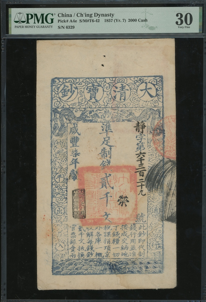 Qing Dynasty, 2000 cash, Da Qing Bao Chao, Xianfeng Year 7(1857), serial number 6329, (Pick A4e), PMG 30 very fine, stained.