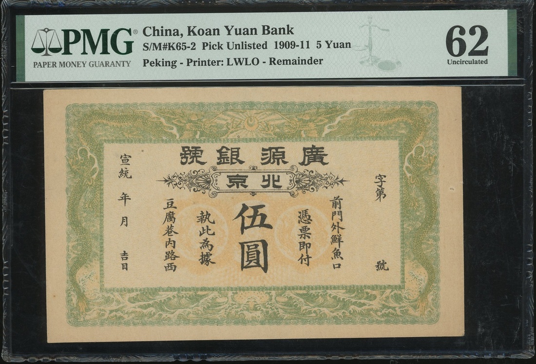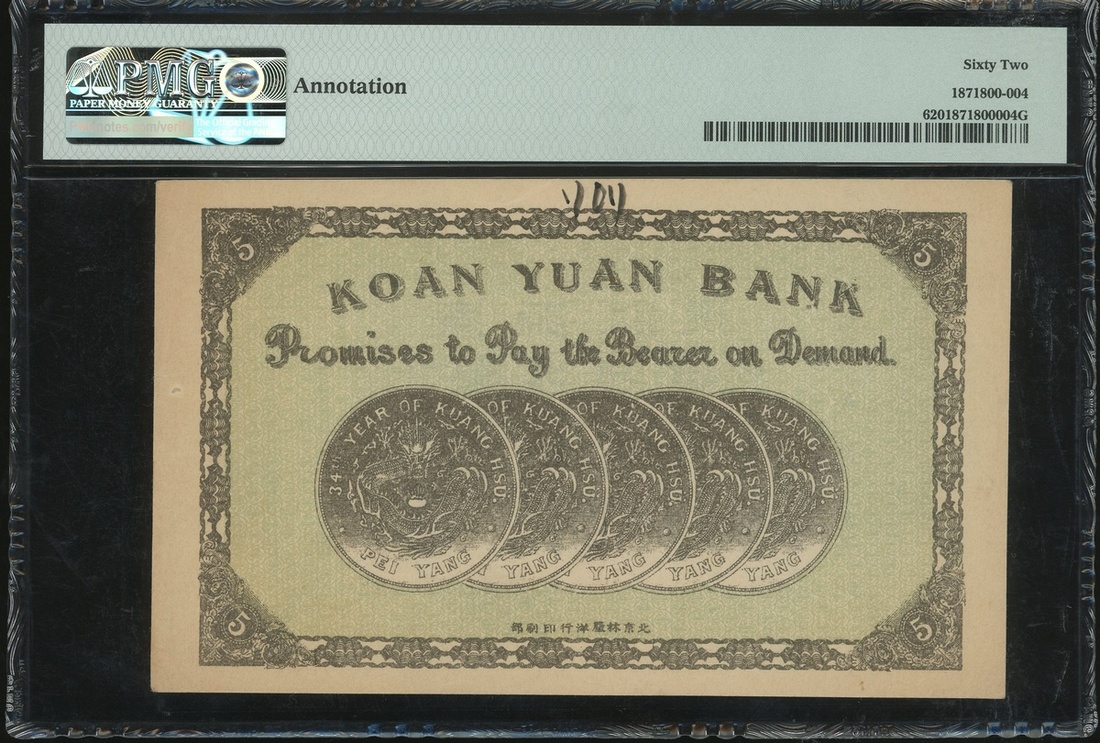 Koan Yuan Bank, 5 yuan, Remainder, ND(1909-11), (Pick unlisted), PMG 62 Uncirculated (Annotation) .