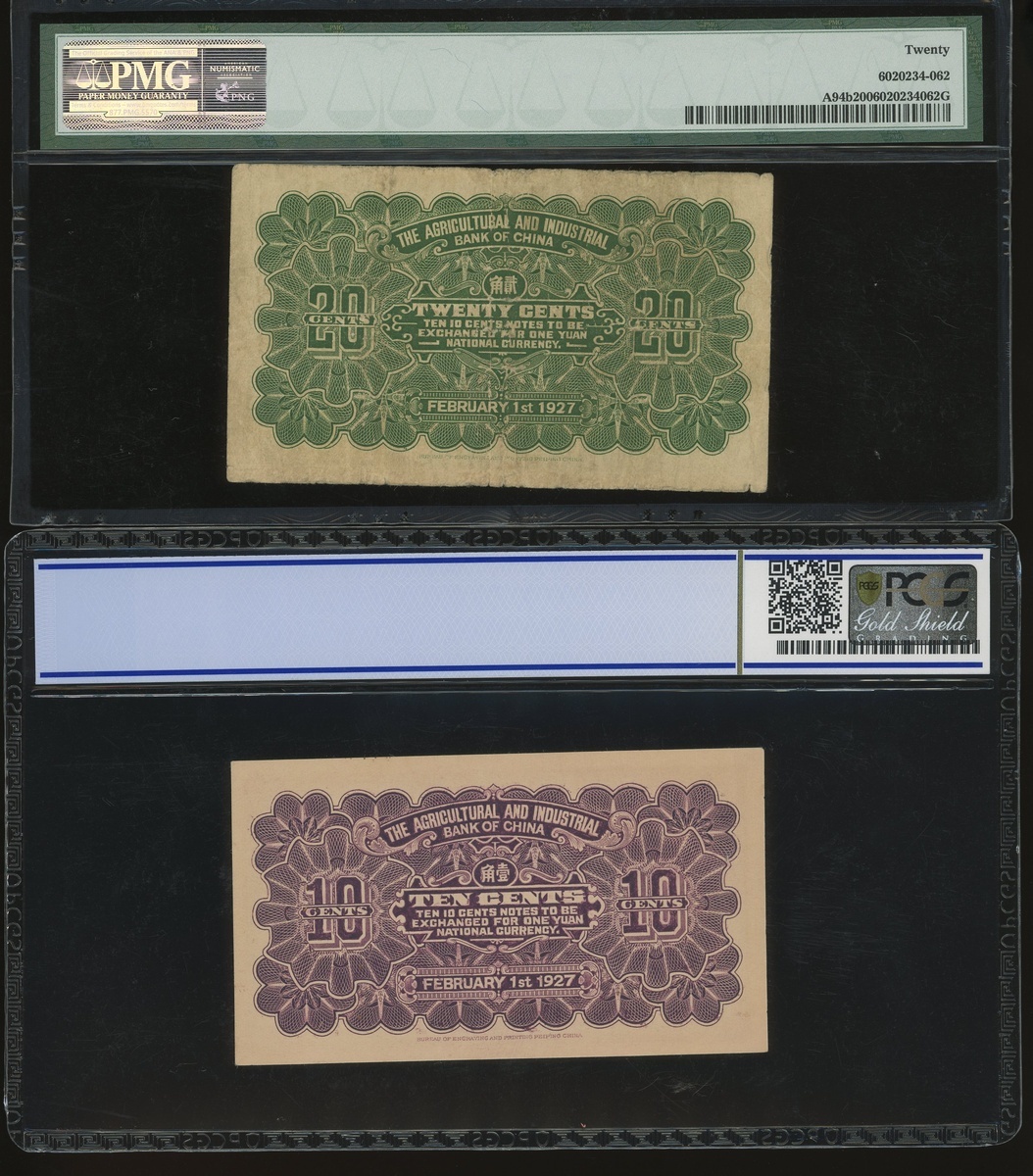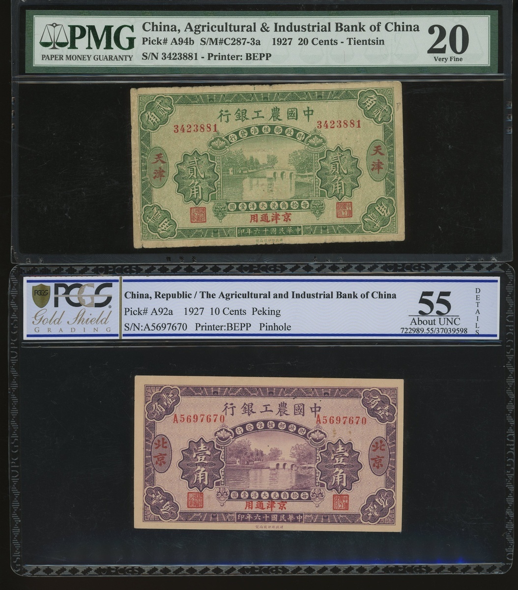 Agricultural & Industrial Bank of China, a pair of 10 cents, Peking and 20 cents, Tientsin, Year 16(1927), serial numbers A5697670 and 3423881, (Pick A92a and A94a), graded PCGS Gold Shield Grading 55 Details (Pinhole) and PMG 20 respectively (2).