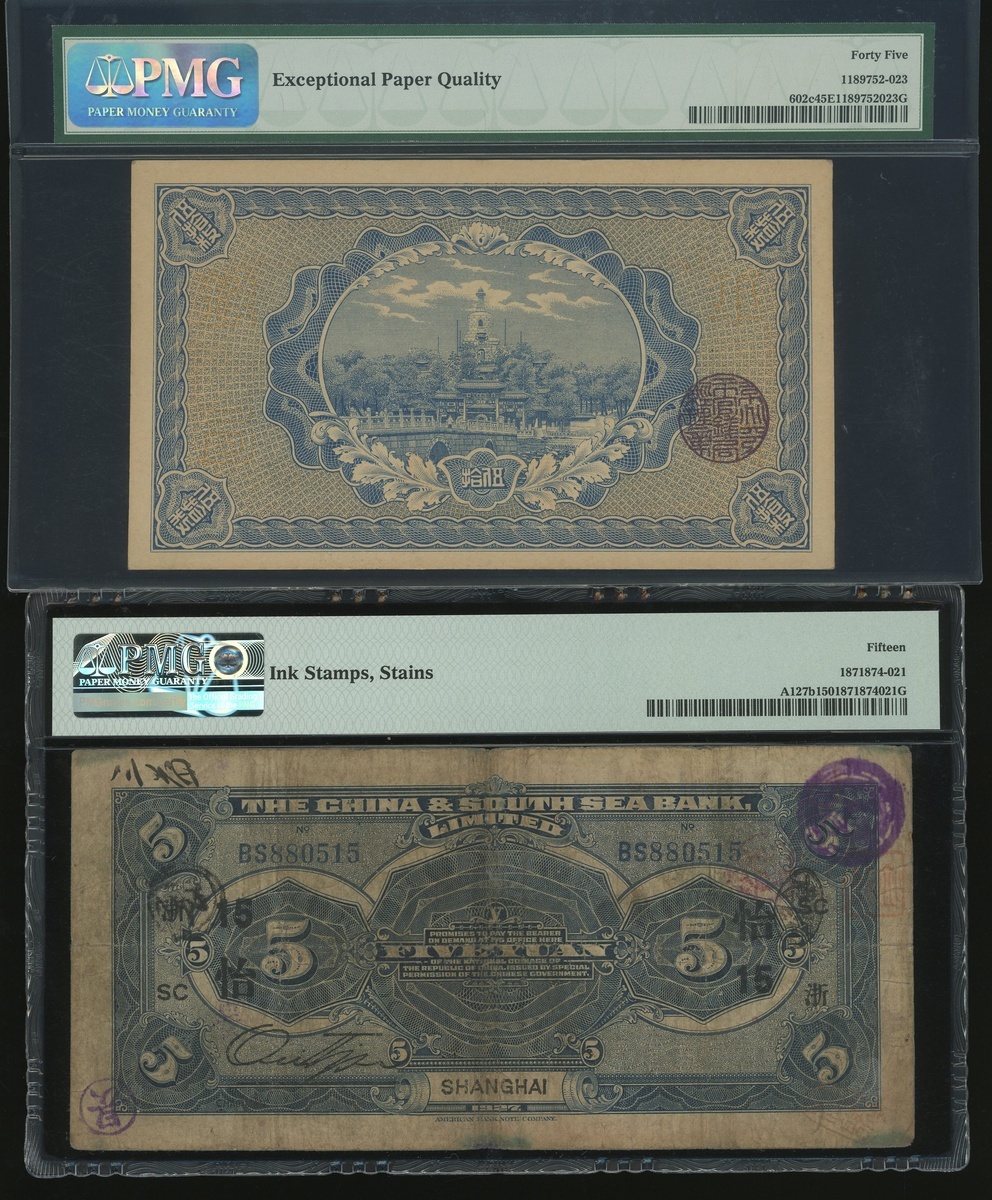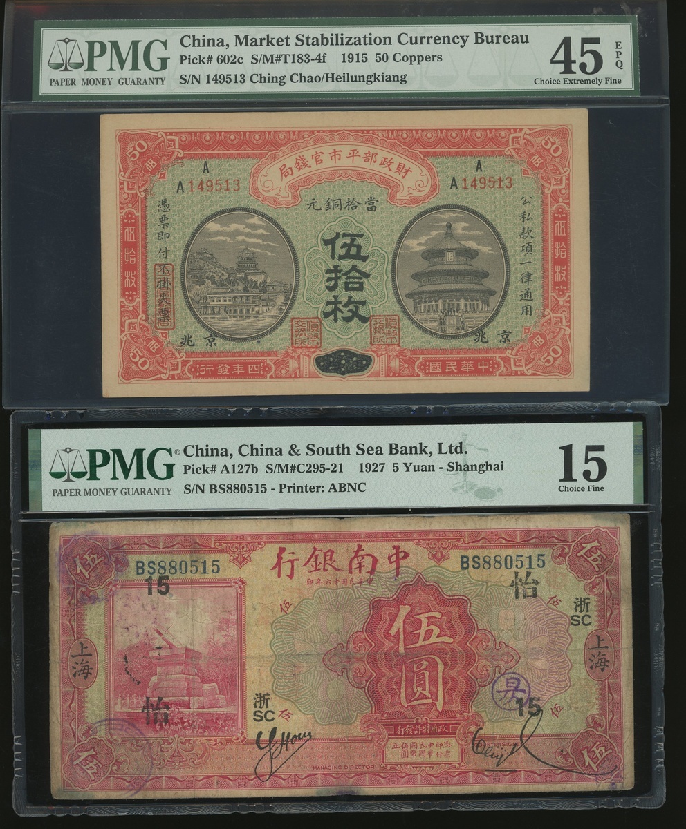 Republican China, 50 coppers, Ching Chao/Heilungkiang, Market Stabilization Currency Bureau, Year 4(1915), and 5 yuan, Shanghai, China & South Sea Bank, Ltd., Year 16(1927), serial numbers 149513 and BS880515, (Pick 602c and A127b), graded PMG 45EPQ and 15(Ink Stamps, Stains) respectively (2) .