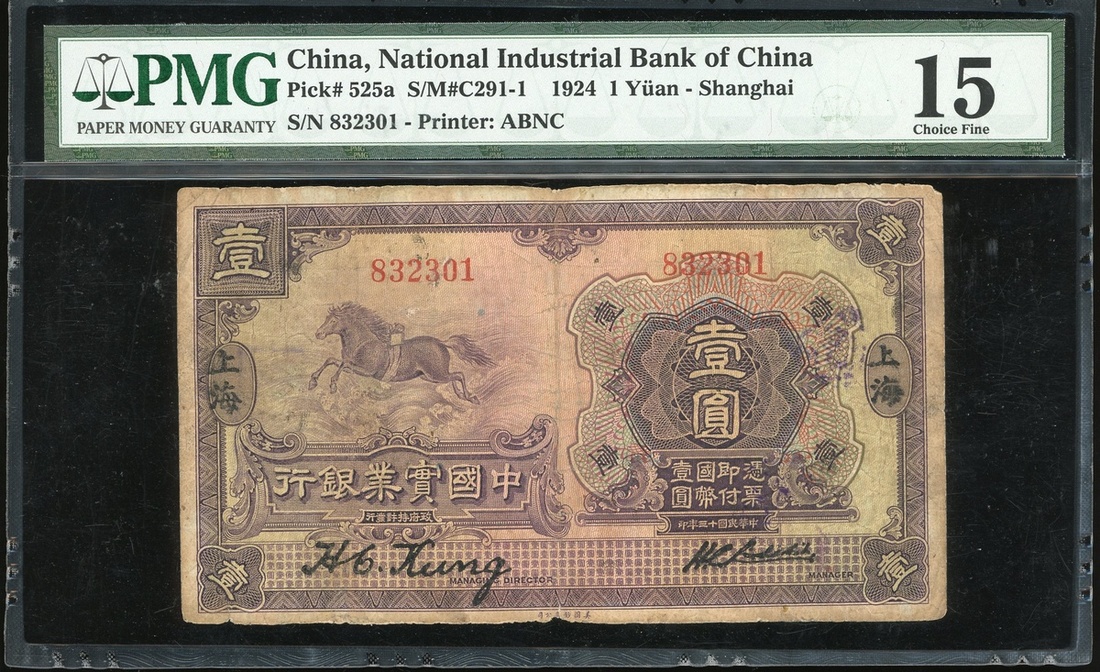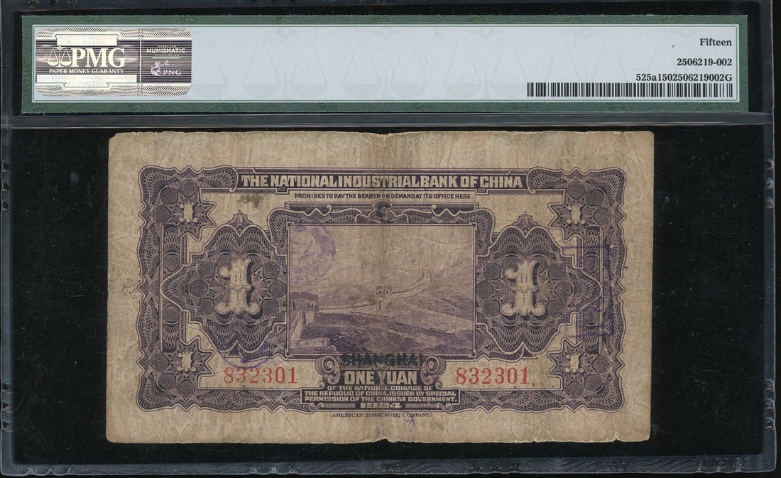 Narional Industrial Bank of China, 1 yuan, Shanghai, Year 13(1924), serial number 832301, (Pick 525a), PMG 15 Choice Fine.
