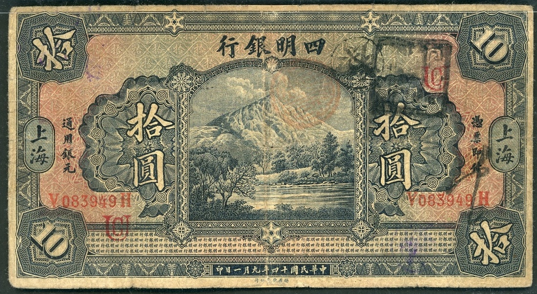 1925年四明銀行10元,編號V038949H,上海地名,F,有修補