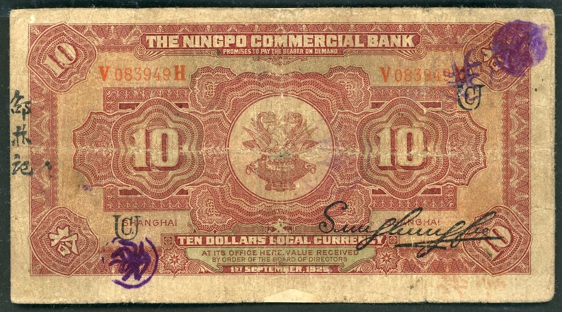 The Ningpo Commercial Bank, 10 yuan, Shanghai, Year 14(1925), serial number V083949H, (Pick 548), fine, repaired, ragged edges, holes at middle.