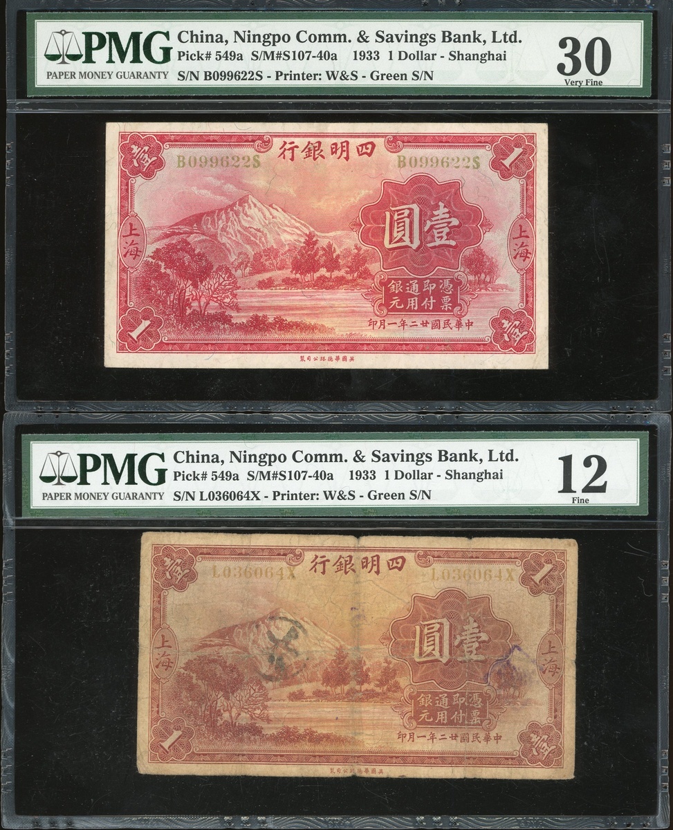Ningpo Commercial & Savings Bank, Ltd, a pair of $1, Shanghai, Year 22(1933), serial number B099622S and L036064X, (Pick 549a), PMG 30 and 12 respectively, the former with fresh colour (2).