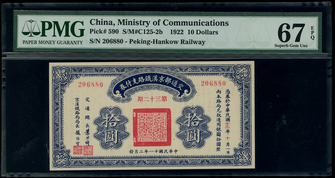Republic of China, Ministry of Communications, Peking-Hankow-Railway, $10, 1922, serial number 206880, (Pick 590), PMG 67EPQ Superb Gem Uncirculated