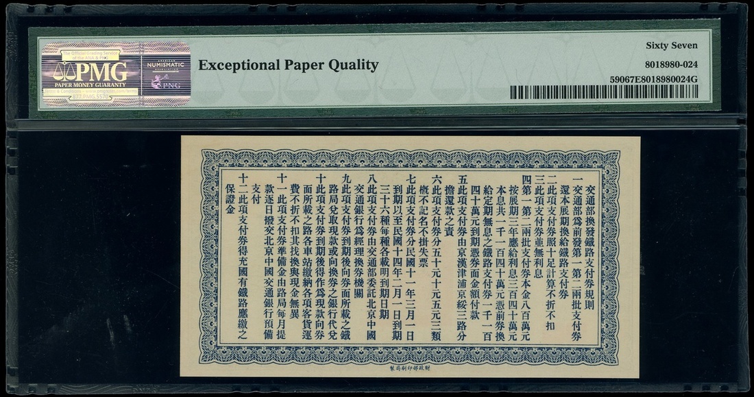 1922年交通部京漢鐵路支付劵10元,編號206880,PMG 67EPQ