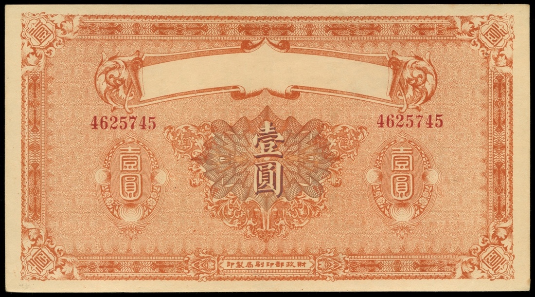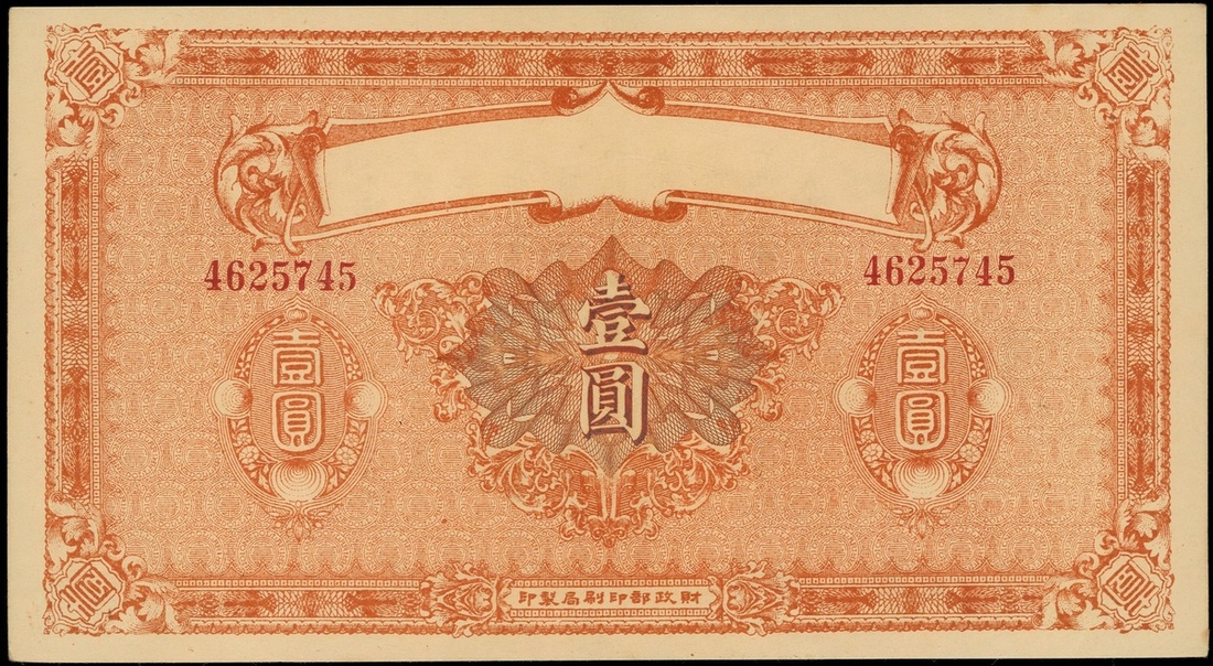 1920年財政部印刷局1元,無發鈔機構名稱錯體,編號4624745,EF,曾壓
