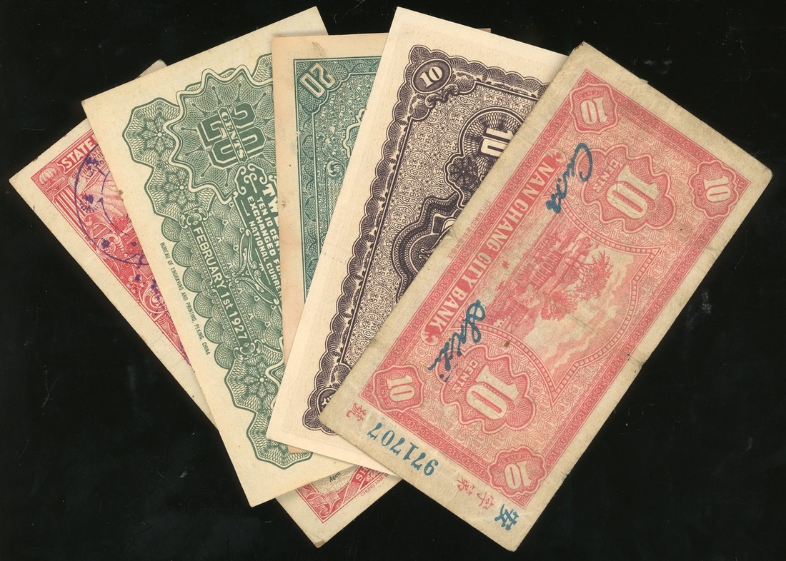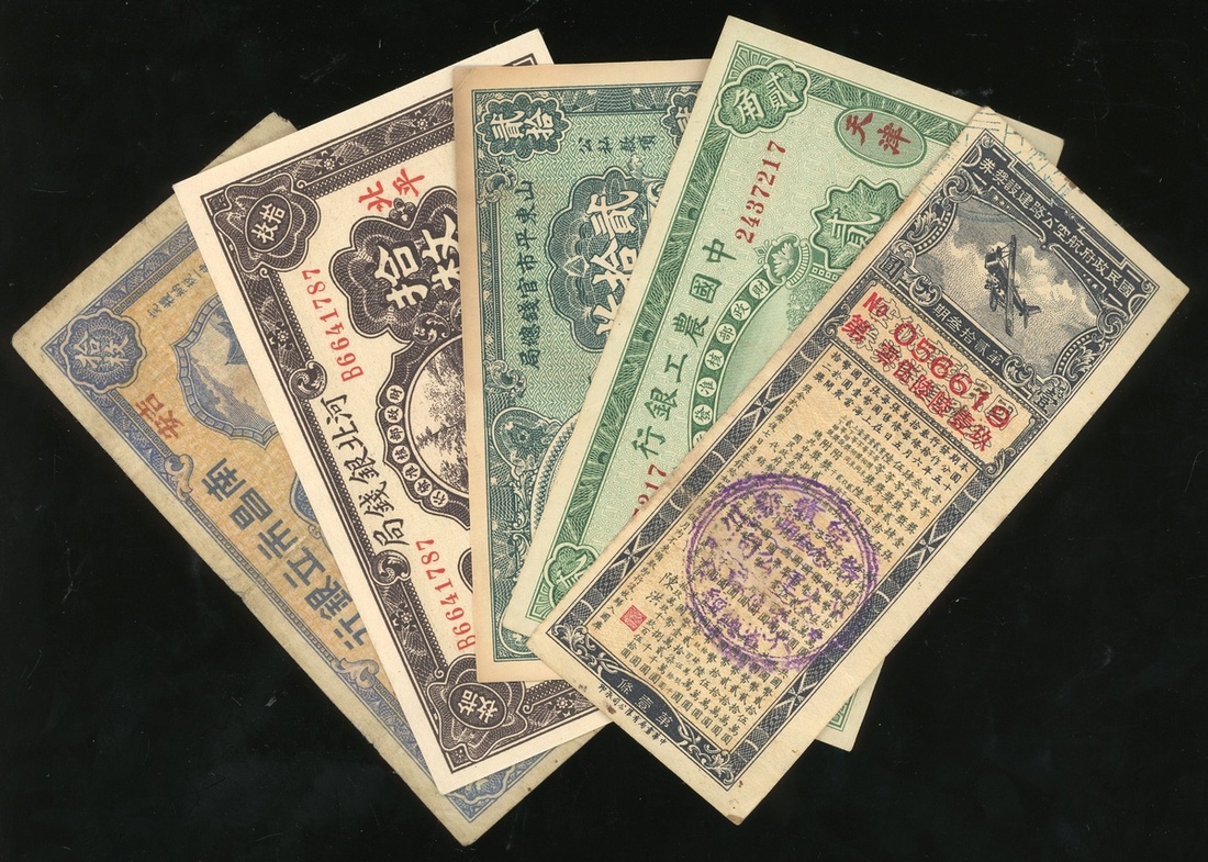 Republic of China, a group of 15x notes, consists of Shantung Exchange Bureau coppers 20 cash, Year 25(1936), the Agricultural and Industrial Bank of China 20 cents, Yr 16(1927), together with an aviation and roads construction lottery ticket,