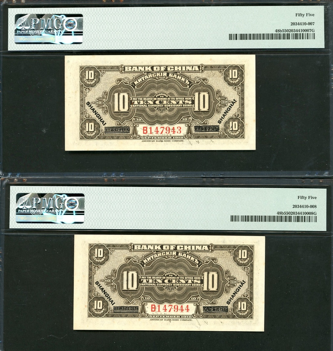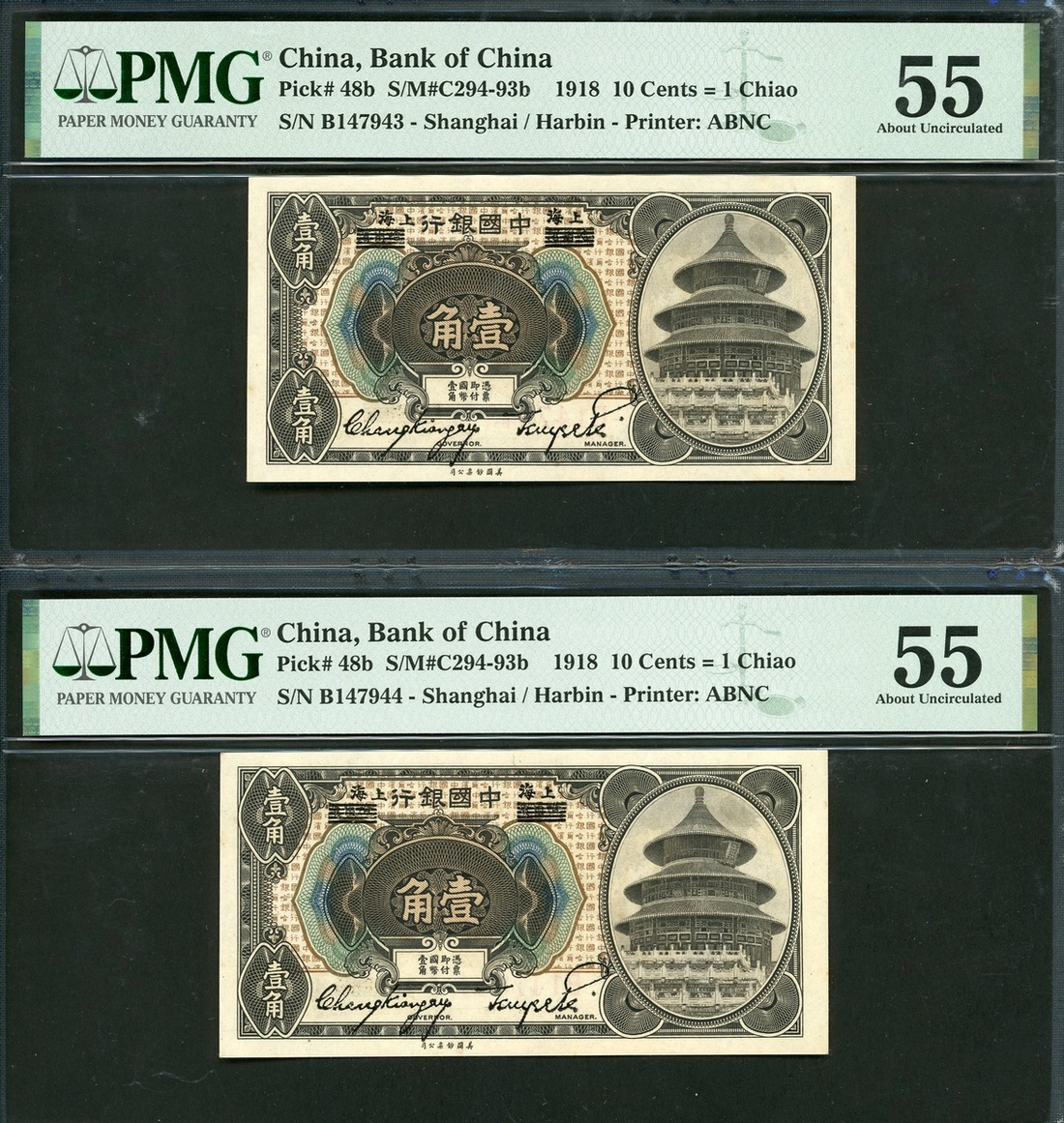 Bank of China, a pair of 10 cents, Shanghai/Harbin, 1918, consecutive serial numbers B147943-944, (Pick 48b), both graded PMG 55 About Uncirculated (2)