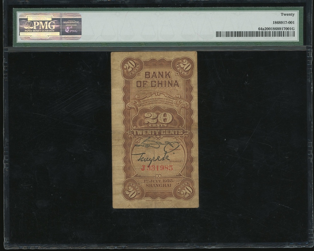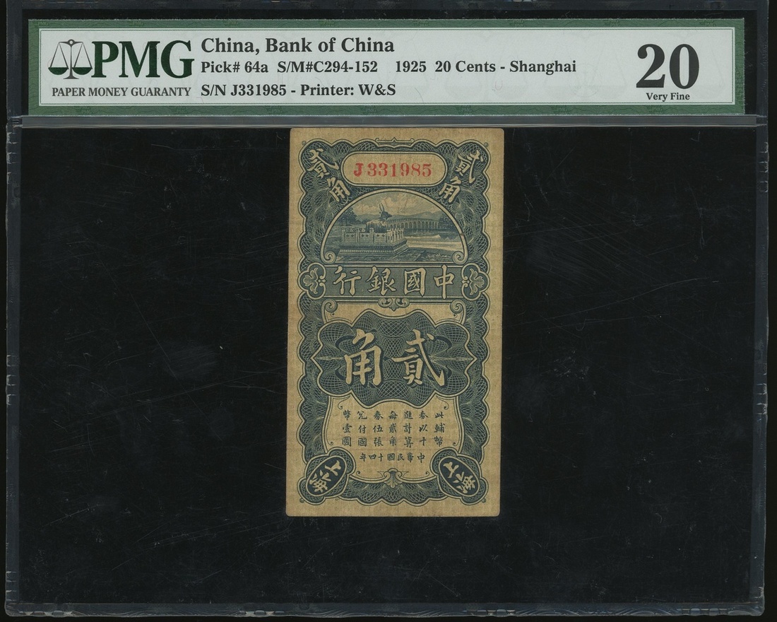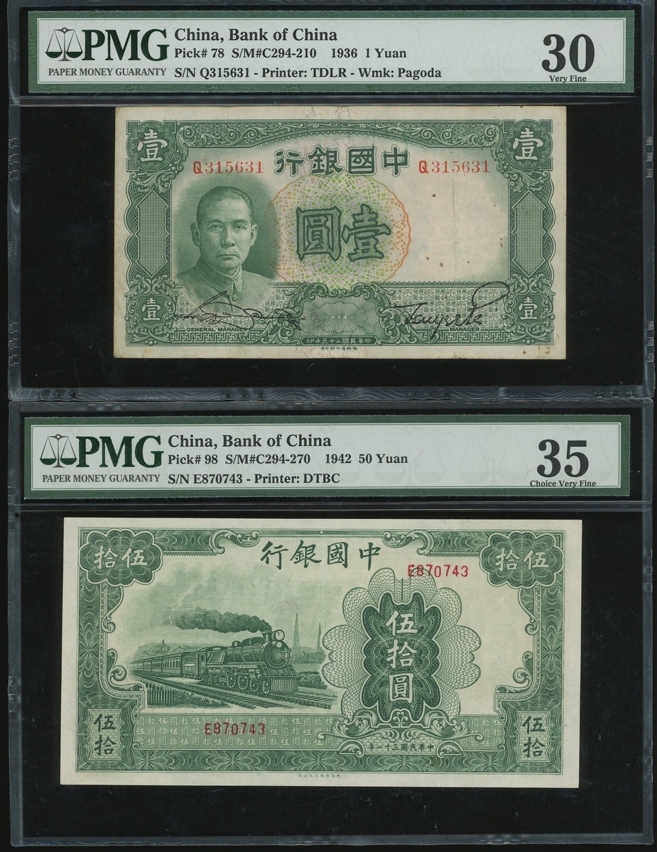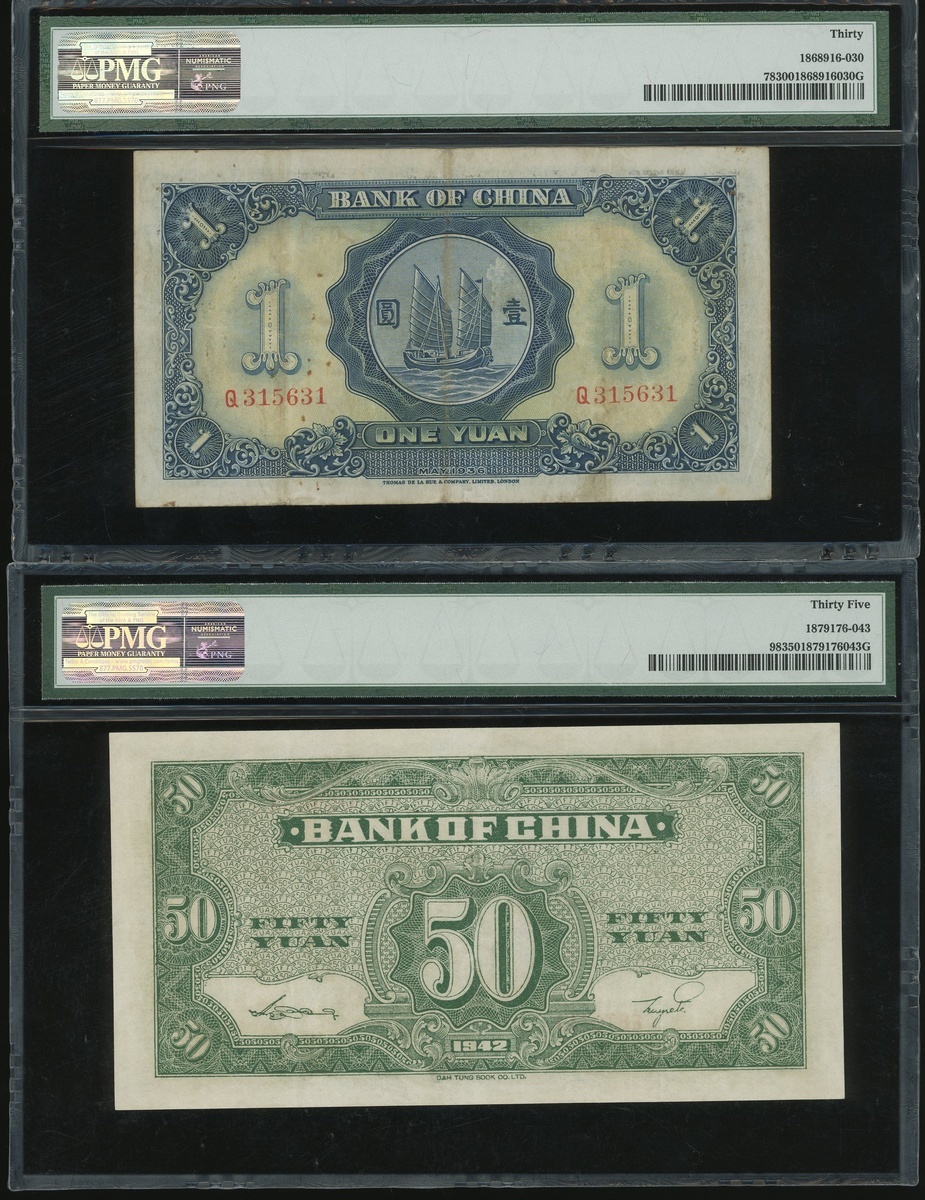 Bank of China, a group of 3x notes, consists of 20 cents, 1 yuan and 50 yuan, 1925-1942, serial numbers J331985, Q315631 and E870743, (Pick 64a, 78 and 98), PMG 20, 35 and 30 respectively (3).