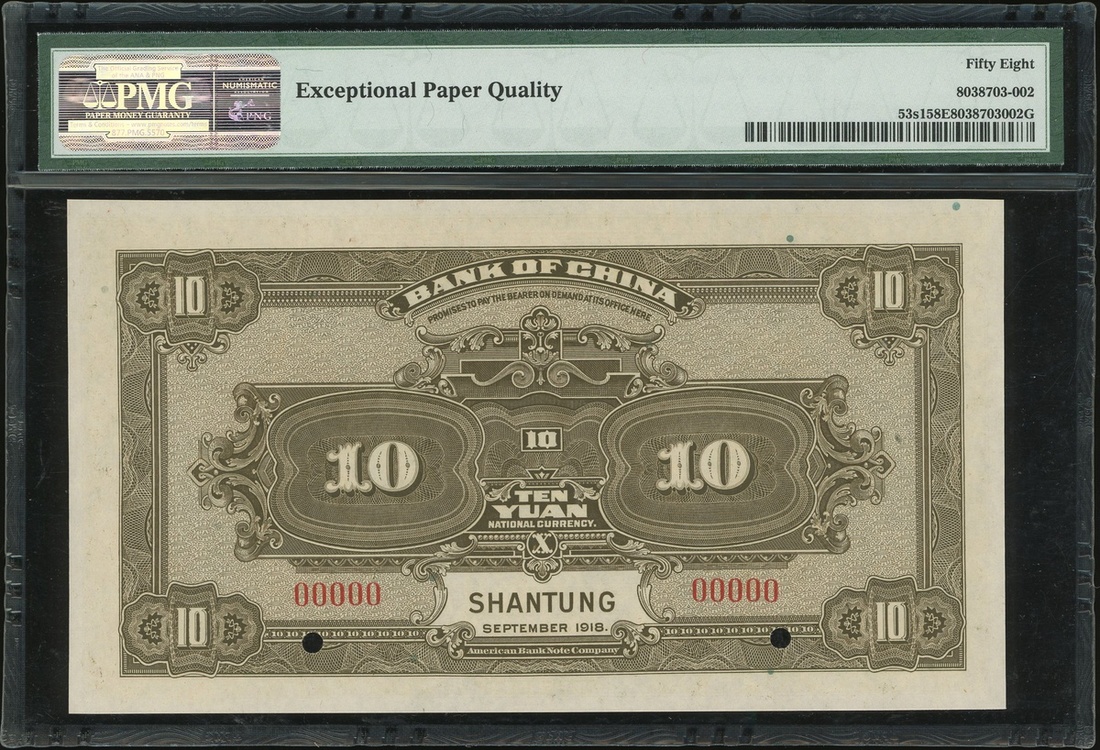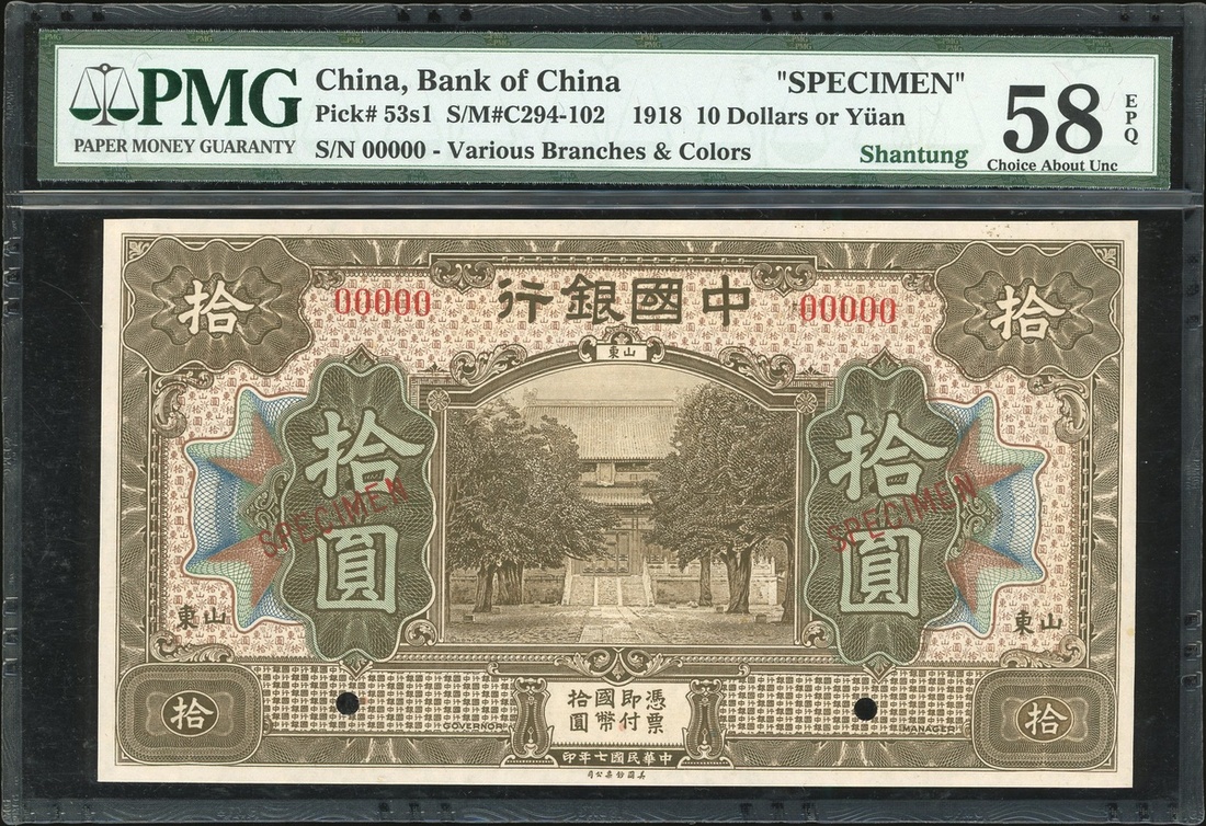 Bank of China, $10, 1918, Shangtung, specimen, serial number 00000, (Pick 53s1), PMG 58EPQ.