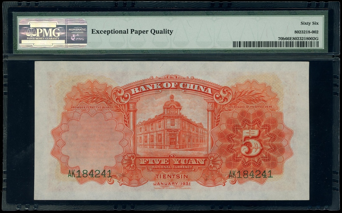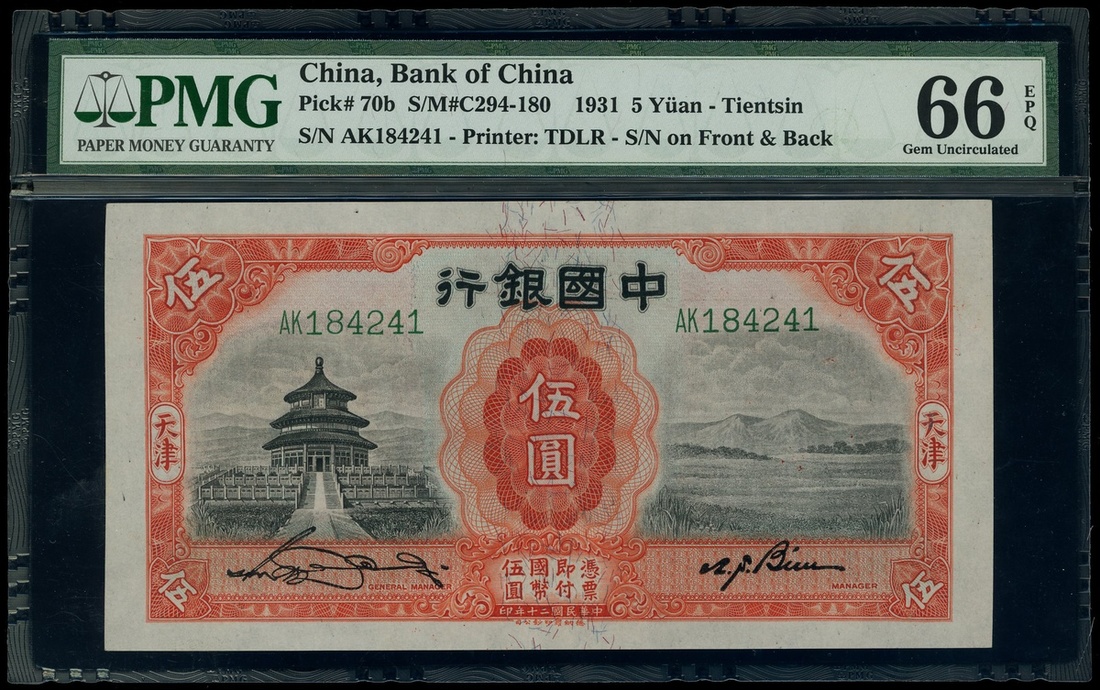 Bank of China, 5 Yuan, Tientsin, 1931, serial number AK184241, (Pick 70b), PMG 66EPQ Gem Uncirculated