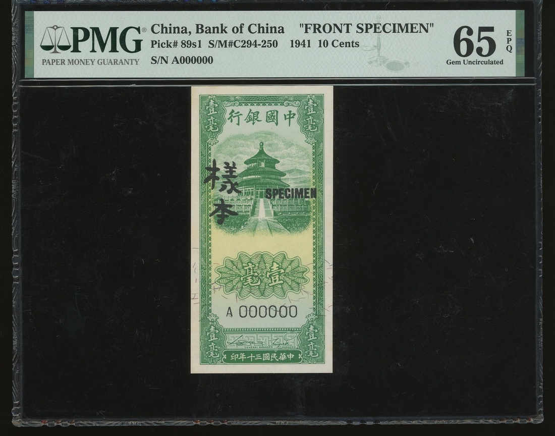 1941年中國銀行1角正反面樣票,編號A000000,均PMG 65EPQ