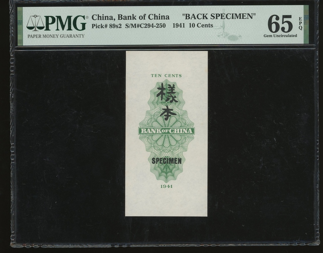 Bank of China, a pair of uniface obverse and reverse specimens, 10 cents, Year 30(1941), serial number A000000 (Pick 89a1 and 89s2), both graded PMG 65EPQ Gem Uncirculated (1 pair) .