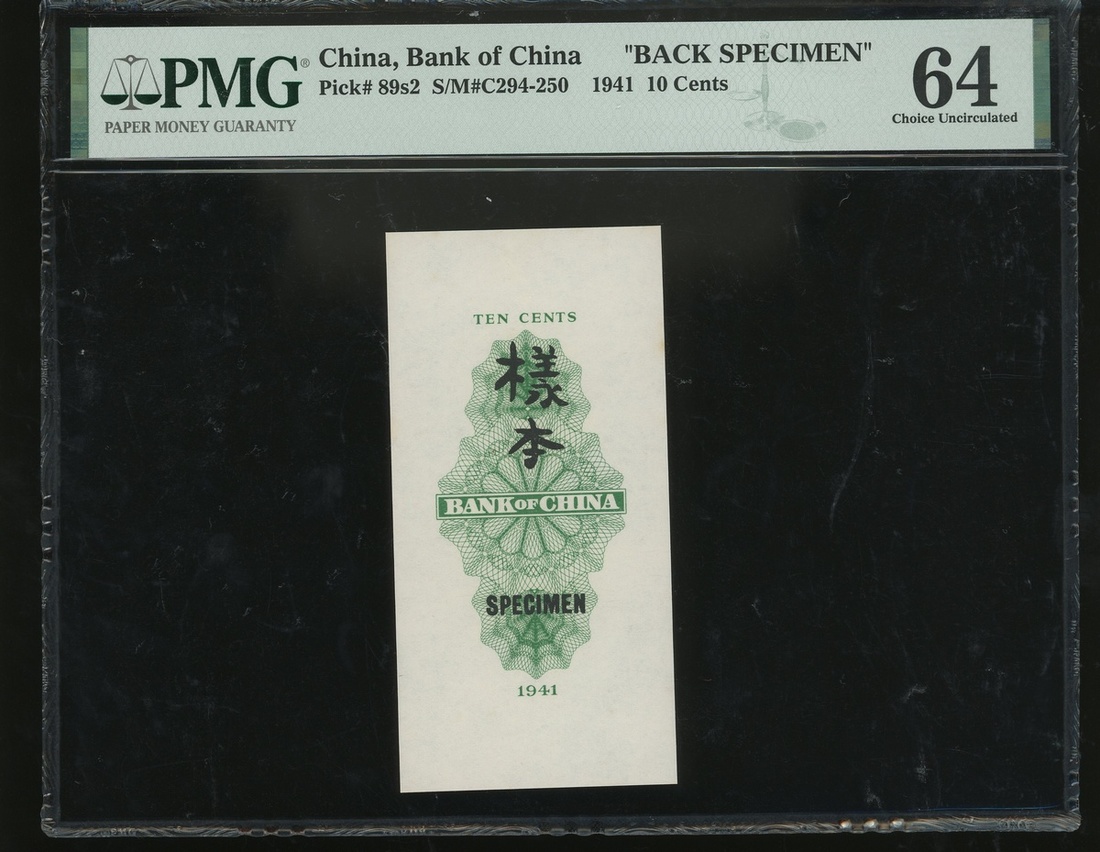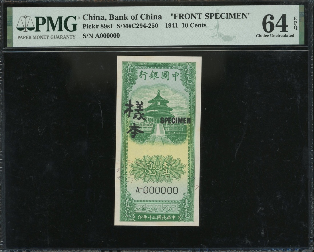 1941年中國銀行1角正反面樣票,編號A000000,均PMG 64-64EPQ