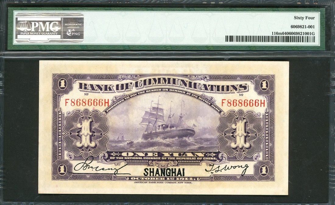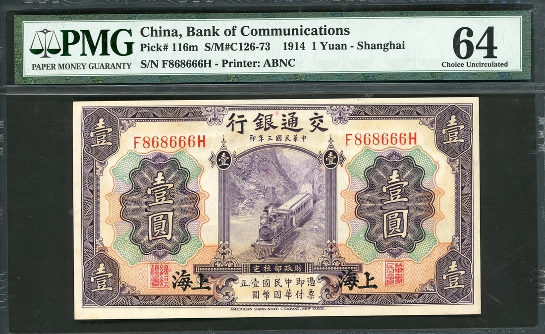 Bank of Communications, 1 yuan, Shanghai, Year 3(1914), serial number F868666H, (Pick 116m), PMG 64 Choice Uncirculated, with mild foxing