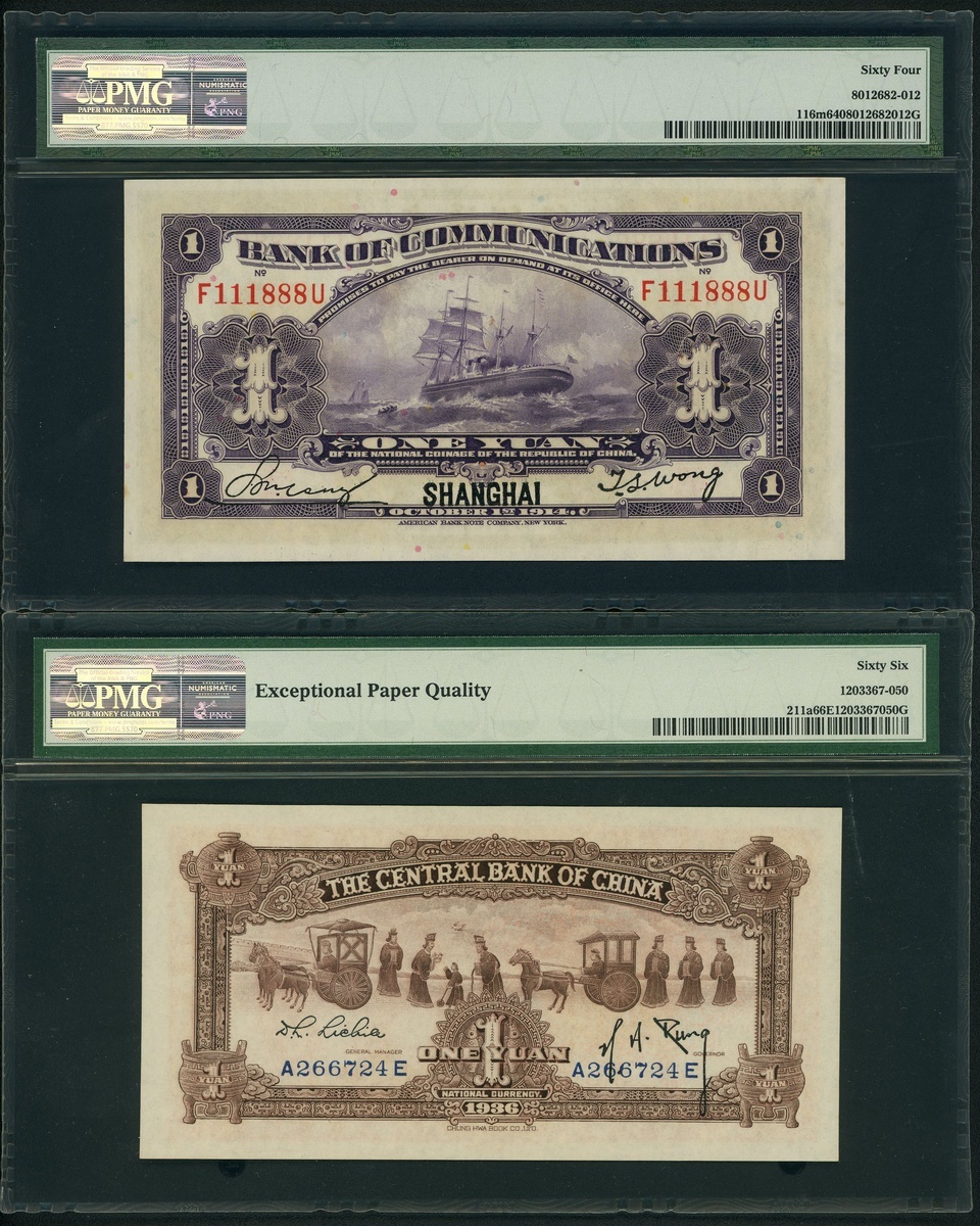 1914年交通銀行1元,上海地名,趣味號F111888U,及1936年中央銀行1元,編號F111888U及A266724E,分別PMG 64 及 66EPQ
