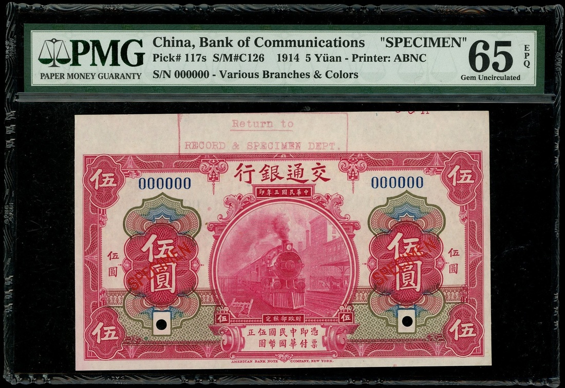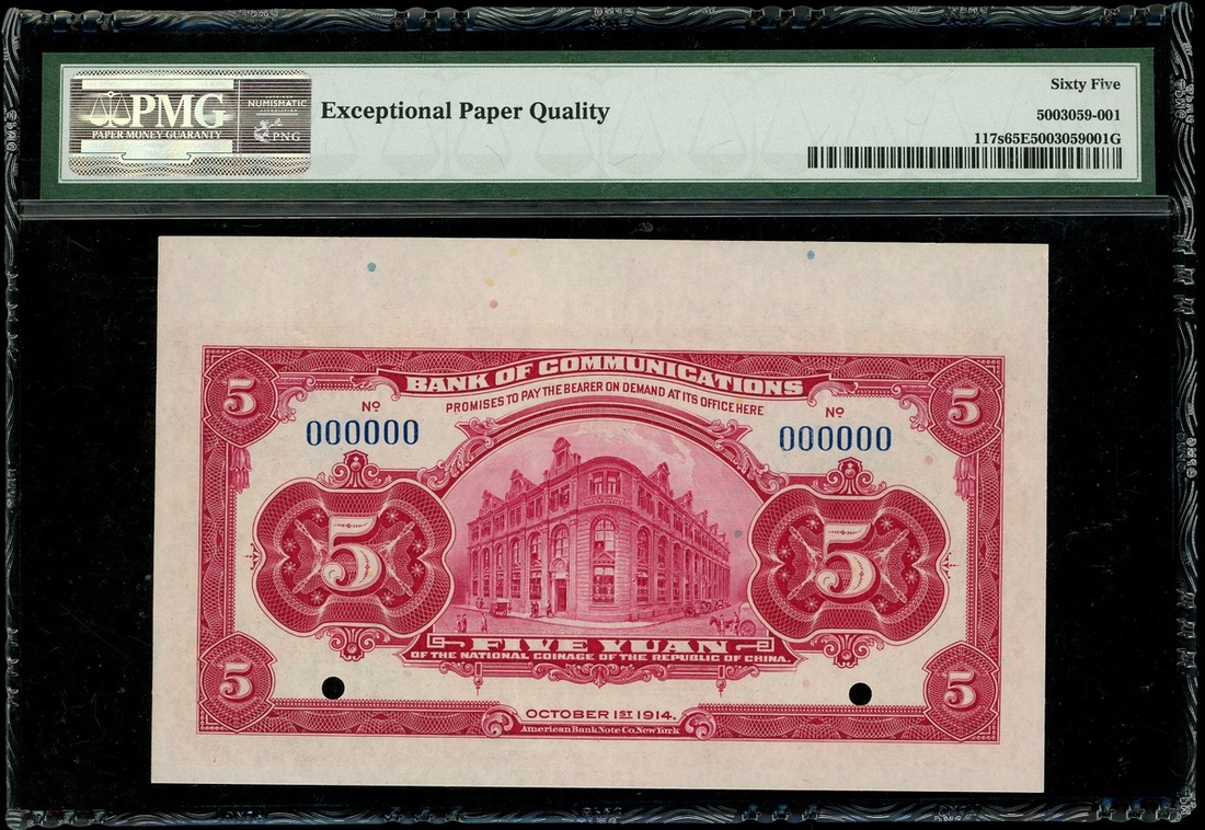 1914年交通銀行5元樣票,編號 000000,PMG 65EPQ,上方帶邊紙
