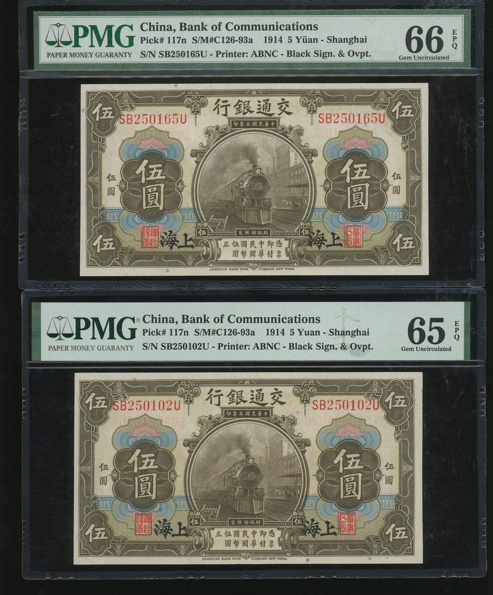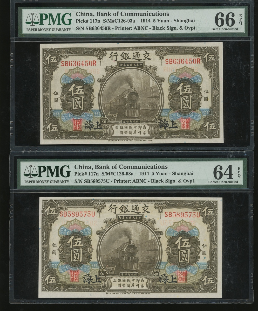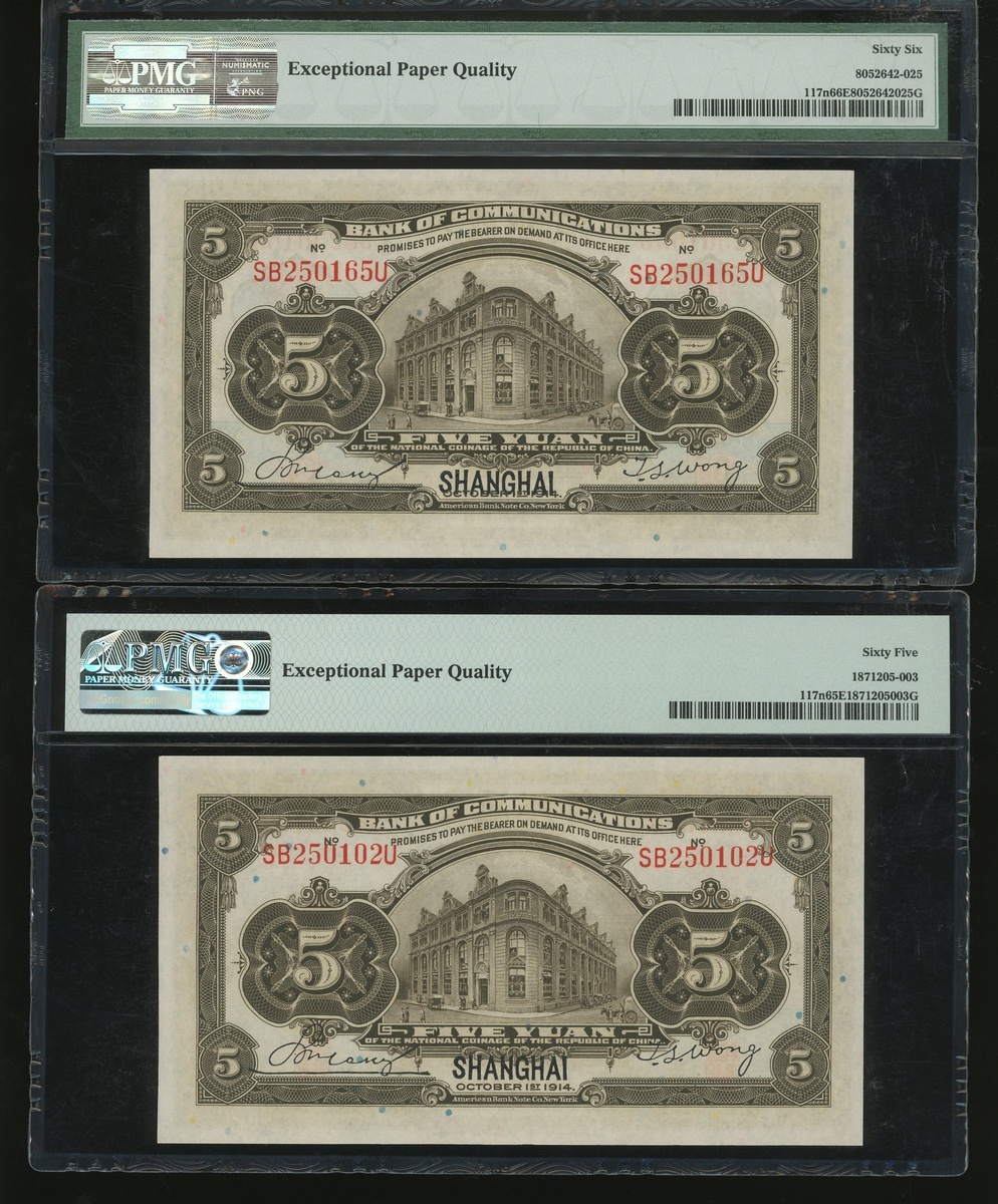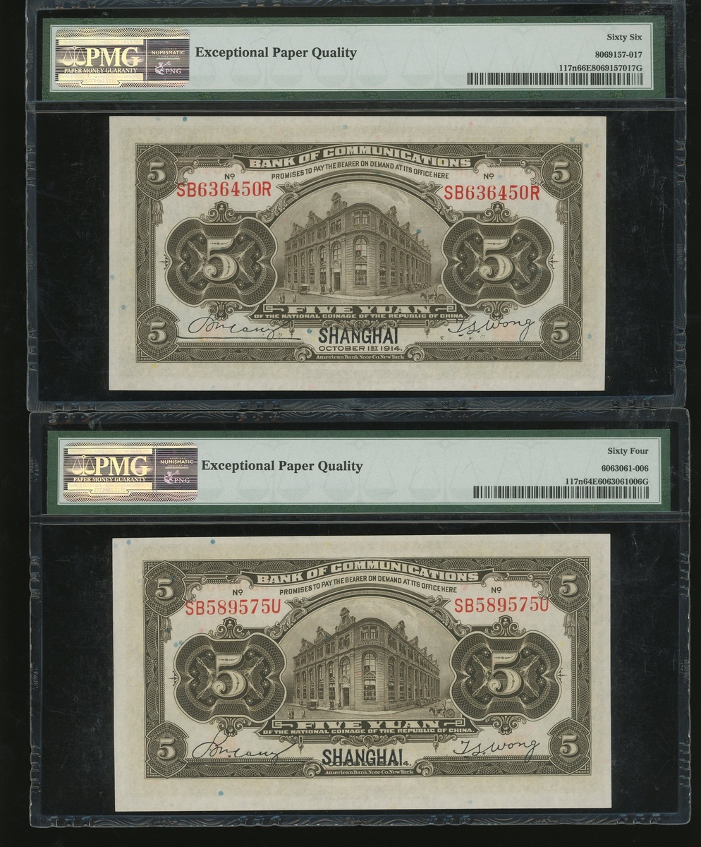 Bank of Communciations, a group of 4x 5 yuan, Shanghai, Year 3(1914), serial numbers SB636450R, SB589575U, SB250165U and SB250102U, (Pick 117n), graded PMG 66EPQ, 64EPQ, 66EPQ and 65EPQ respectively (4) .