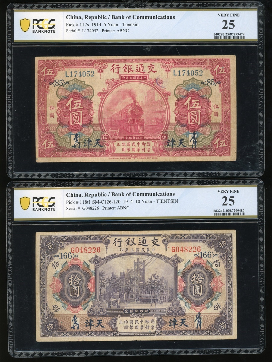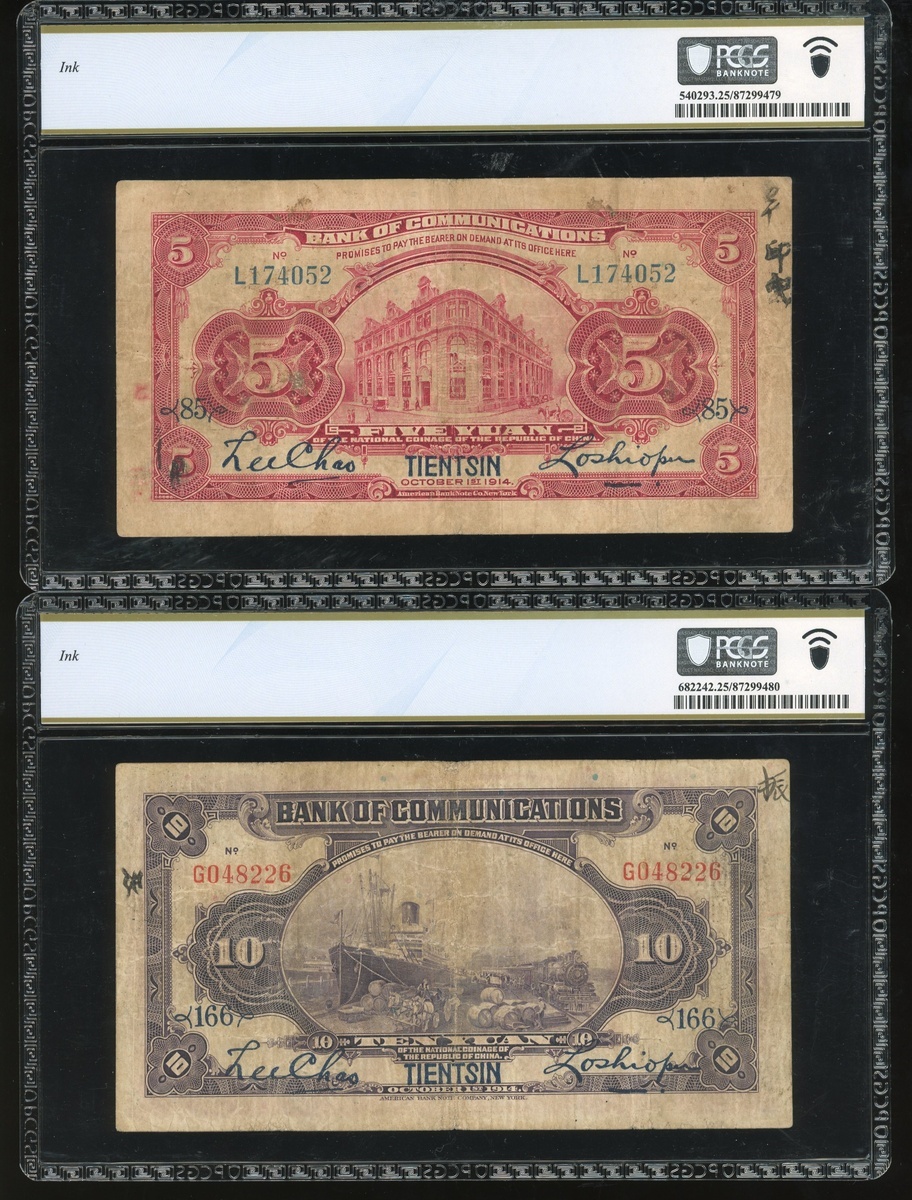 Bank of Communciations, a pair of 5 yuan and 10 yuan, Tientsin, Year 3(1914), serial numbers L174052 and G048226, (Pick 117s and 118t1), both graded PCGS Banknote 25 Very Fine (Ink) (2).