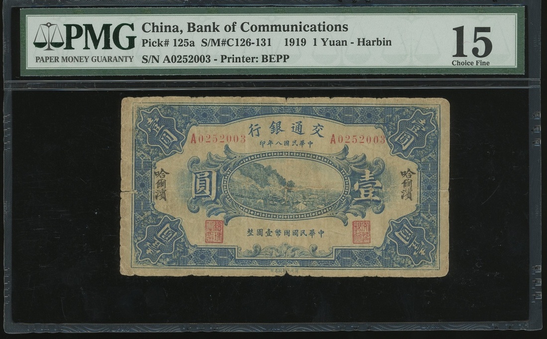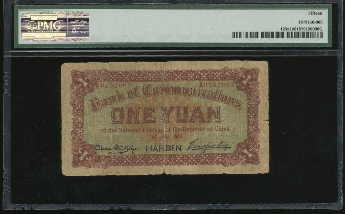 Bank of Communciations 1 yuan, Harbin, Year 8 (1919), serial number A0252003, (Pick 125a), PMG 15 Choice Fine and scarce