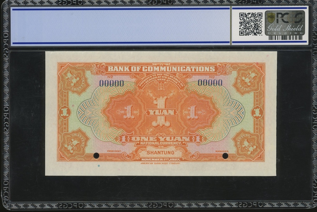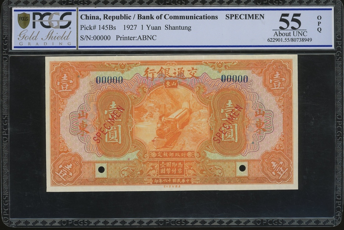 Bank of Communciations, 1 yuan, Shantung, SPECIMEN, Year 16(1927), serial number 00000, (Pick 145Bs), PCGS Gold Shield Grading 55OPQ About Uncirculated