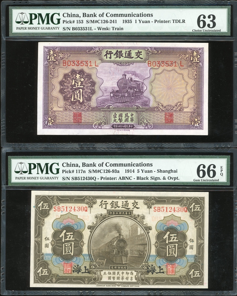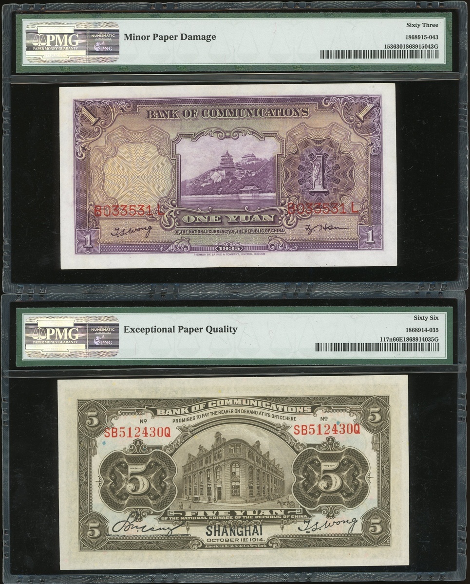 Bank of Communciations, a pair of 1 yuan and 5 yuan, Year 24(1935) and Year 3(1914), serial numbers B033531L and SB512430Q, (Pick 153 and 117n), graded PMG 63 and 66EPQ Gem Uncirculated respectively (2).