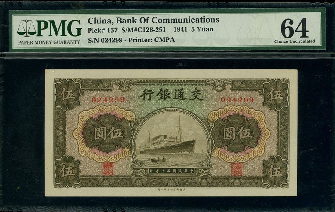 Bank of Communications, 5 Yuan, 1941, serial number 024299, (Pick 157), PMG 64 Choice Uncirculated